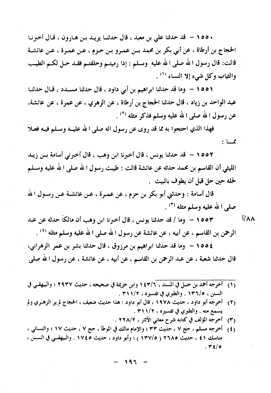 1552 - قَدْ حَدَّثَنَا يُونُسُ، قَالَ: أَخْبَرَنَا ابْنُ وَهْبٍ، قَالَ: أَخْبَرَنِي أُسَامَةُ بْنُ زَيْدٍ اللَّيْثِيُّ، أَنَّ الْقَاسِمَ بْنَ مُحَمَّدٍ، حَدَّثَهُ عَنْ عَائِشَةَ، قَالَتْ: " طَيَّبْتُ رَسُولَ اللهِ صَلَّى اللَّهُ عَلَيْهِ وَسَلَّمَ لِحِلِّهِ حِينَ حَلَّ قَبْلَ أَنْ يَطُوفَ بِالْبَيْتِ " قَالَ أُسَامَةُ: وَحَدَّثَنِي أَبُو بَكْرِ بْنُ حَزْمٍ، عَنْ عَمْرَةَ، عَنْ عَائِشَةَ، عَنْ رَسُولِ اللهِ صَلَّى اللَّهُ عَلَيْهِ وَسَلَّمَ، مِثْلَهُ
