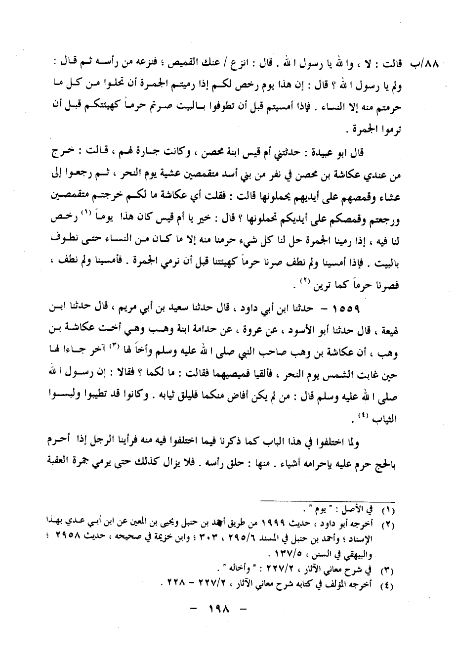 1559 - حَدَّثَنَا ابْنُ أَبِي دَاوُدَ، قَالَ: حَدَّثَنَا سَعِيدُ بْنُ أَبِي مَرْيَمَ، قَالَ: حَدَّثَنَا ابْنُ لَهِيعَةَ، قَالَ: حَدَّثَنَا أَبُو الْأَسْوَدِ، عَنْ عُرْوَةَ، عَنْ جُدَامَةَ ابْنَةِ وَهْبٍ وَهِيَ أُخْتُ عُكَاشَةَ بْنِ وَهْبٍ، أَنَّ عُكَاشَةَ بْنَ وَهْبٍ صَاحِبَ النَّبِيِّ صَلَّى اللَّهُ عَلَيْهِ وَسَلَّمَ، وَأَخًا لَهَا آخَرَ، جَاءَا لَهَا حِينَ غَابَتِ الشَّمْسُ يَوْمَ النَّحْرِ، فَأَلْقَيَا قَمِيصَيْهِمَا، فَقَالَتْ: مَا لَكُمَا؟ فَقَالَا: إِنَّ رَسُولَ اللهِ صَلَّى اللَّهُ عَلَيْهِ وَسَلَّمَ، قَالَ: " مَنْ لَمْ يَكُنْ أَفَاضَ مِنْكُمَا فَلْيَلْقِ ثِيَابَهُ " وَكَانُوا قَدْ تَطَيَّبُوا وَلَبِسُوا الثِّيَابَ وَلَمَّا اخْتَلَفُوا فِي هَذَا الْبِابِ كَمَا ذَكَرْنَا فِيمَا اخْتَلَفُوا فِيهِ مِنْهُ، فَرَأَيْنَا الرَّجُلَ إِذَا أَحْرَمَ بِالْحَجِّ حَرُمَ عَلَيْهِ بِإِحْرَامِهِ أَشْيَاءُ، مِنْهَا حَلْقُ رَأْسِهِ، فَلَا يَزَالُ كَذَلِكَ حَتَّى يَرْمِيَ جَمْرَةَ الْعَقَبَةِ