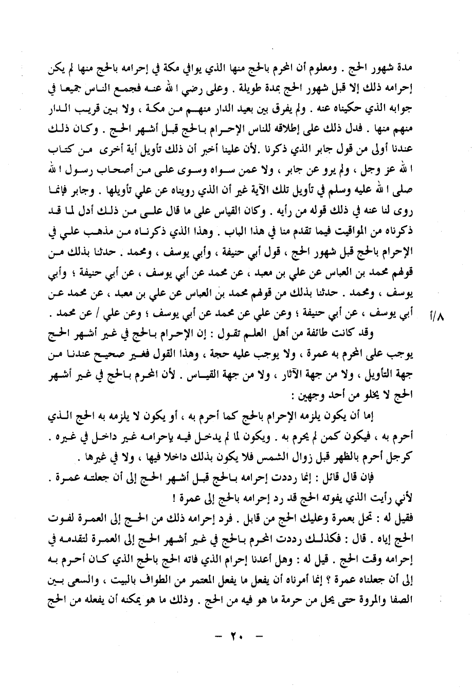 تَقَدَّمَ مِنَّا فِي هَذَا الْبَابِ وَهَذَا الَّذِي ذَكَرْنَاهُ مِنْ مَذْهَبِ عَلِيٍّ فِي الْإِحْرَامِ بِالْحَجِّ قَبْلَ شُهُورِ الْحَجِّ، قَوْلُ أَبِي حَنِيفَةَ، وَأَبِي يُوسُفَ، وَمُحَمَّدٍ حَدَّثَنَا بِذَلِكَ مِنْ قَوْلِهِمْ مُحَمَّدُ بْنُ الْعَبَّاسِ، عَنْ عَلِيِّ بْنِ مَعْبَدٍ، عَنْ مُحَمَّدٍ، عَنْ أَبِي يُوسُفَ، عَنْ أَبِي حَنِيفَةَ، وَأَبِي يُوسُفَ، وَمُحَمَّدٍ حَدَّثَنَا بِذَلِكَ مِنْ قَوْلِهِمْ مُحَمَّدُ بْنُ الْعَبَّاسِ، عَنْ عَلِيِّ بْنِ مَعْبَدٍ، عَنْ مُحَمَّدٍ، عَنْ أَبِي يُوسُفَ، عَنْ أَبِي حَنِيفَةَ، وَعَنْ عَلِيٍّ، عَنْ مُحَمَّدٍ، عَنْ أَبِي يُوسُفَ، وَعَنْ عَلِيٍّ، عَنْ مُحَمَّدٍ وَقَدْ كَانَتْ طَائِفَةٌ مِنْ أَهْلِ الْعِلْمِ، تَقُولُ: إِنَّ الْإِحْرَامَ بِالْحَجِّ فِي غَيْرِ أَشْهُرِ الْحَجِّ يُوجِبُ عَلَى الْمُحْرِمِ بِهِ عُمْرَةً، وَلَا يُوجِبُ عَلَيْهِ حَجَّةً، وَهَذَا الْقَوْلُ فَغَيْرُ صَحِيحٍ عِنْدَنَا مِنْ جِهَةِ التَّأْوِيلِ، وَلَا مِنْ جِهَةِ الْآثَارِ، وَلَا مِنْ جِهَةِ الْقِيَاسِ، لِأَنَّ الْمُحْرِمَ بِالْحَجِّ فِي غَيْرِ أَشْهُرِ الْحَجِّ لَا يَخْلُو مِنْ أَحَدِ وَجْهَيْنِ: إِمَّا أَنْ يَكُونَ يَلْزَمُهُ الْإِحْرَامُ بِالْحَجِّ كَمَا أَحْرَمَ بِهِ، أَوْ يَكُونَ لَا يَلْزَمُهُ بِهِ الْحَجُّ الَّذِي أَحْرَمَ بِهِ، فَيَكُونُ كَمَنْ لَمْ يُحْرِمْ بِهِ، وَيَكُونُ لَمَّا لَمْ يَدْخُلْ فِيهِ بِإِحْرَامِهِ غَيْرَ دَاخِلٍ فِي غَيْرِهِ، كَرَجُلٍ أَحْرَمَ بِالظُّهْرِ قَبْلَ زَوَالِ الشَّمْسِ، فَلَا يَكُونُ بِذَلِكَ دَاخِلًا فِيهَا، وَلَا فِي غَيْرِهَا فَإِنْ قَالَ قَائِلٌ: إِنَّمَا رَدَدْتُ إِحْرَامَهُ بِالْحَجِّ قَبْلَ أَشْهُرِ الْحَجِّ إِلَى أَنْ جَعَلْتُهُ عُمْرَةً، لِأَنِّي رَأَيْتُ الَّذِي يَفُوتُهُ الْحَجُّ قَدْ رُدَّ إِحْرَامُهُ بِالْحَجِّ إِلَى عُمْرَةٍ فَقِيلَ لَهُ: تُحِلُّ بِعُمْرَةٍ وَعَلَيْكَ الْحَجُّ مِنْ قَابِلٍ فَرُدَّ إِحْرَامُهُ ذَلِكَ مِنَ الْحَجِّ إِلَى الْعُمْرَةِ لِفَوْتِ الْحَجِّ