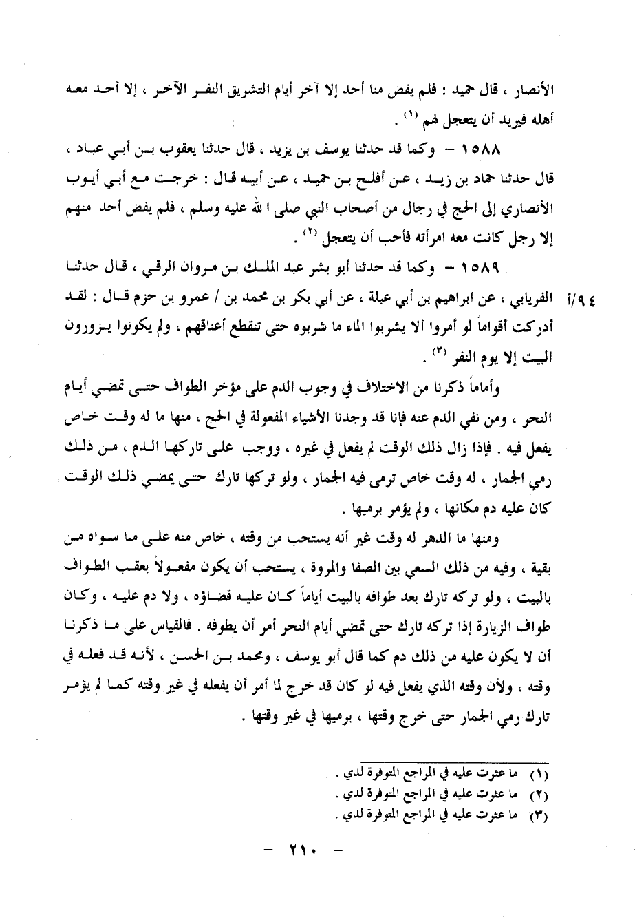 1589 - وَكَمَا قَدْ حَدَّثَنَا أَبُو بِشْرٍ عَبْدُ الْمَلِكِ بْنُ مَرَوَانَ الرَّقِّيُّ، قَالَ: حَدَّثَنَا الْفِرْيَابِيُّ، عَنْ إِبْرَاهِيمَ بْنِ أَبِي عَبْلَةَ، عَنْ أَبِي بَكْرِ بْنِ مُحَمَّدِ بْنِ عَمْرِو بْنِ حَزْمٍ، قَالَ: " لَقَدْ أَدْرَكْتُ أَقْوَامًا لَوْ أُمِرُوا أَلَّا يَشْرَبُوا الْمَاءَ مَا شَرِبُوهُ حَتَّى تَنْقَطِعَ أَعْنَاقُهُمْ، وَلَمْ يَكُونُوا يَزُورُونَ الْبَيْتَ إِلَّا يَوْمَ النَّفْرِ " وَأَمَّا مَا ذَكَرْنَا مِنَ الِاخْتِلَافِ فِي وُجُوبِ الدَّمِ عَلَى مُؤَخَّرِ الطَّوَافِ حَتَّى تَمْضِيَ أَيَّامُ النَّحْرِ، وَمِنْ نَفْيِ الدَّمِ عَنْهُ، فَإِنَّا قَدْ وَجَدْنَا الْأَشْيَاءَ الْمَفْعُولَةَ فِي الْحَجِّ، مِنْهَا مَا لَهُ وَقْتٌ خَاصٌّ يُفْعَلُ فِيهِ، فَإِذَا زَالَ ذَلِكَ الْوَقْتُ لَمْ يُفْعَلْ فِي غَيْرِهِ، وَوَجَبَ عَلَى تَارِكِهَا الدَّمُ، مِنْ ذَلِكَ رَمْيُ الْجِمَارِ، لَهُ وَقْتٌ خَاصٌّ تُرْمَى فِيهِ الْجِمَارُ، وَلَوْ تَرَكَهَا تَارِكٌ، حَتَّى يَمْضِيَ ذَلِكَ الْوَقْتُ كَانَ عَلَيْهِ دَمٌ مَكَانَهَا، وَلَمْ يُؤْمَرْ بِرَمْيِهَا وَمِنْهَا مَا الدَّهْرُ لَهُ وَقْتٌ غَيْرَ أَنَّهُ يُسْتَحَبُّ مِنْ وَقْتِهِ، خَاصٌّ مِنْهُ عَلَى مَا سِوَاهُ مِنْ بَقِيَّةٍ، وَفِيهِ مِنْ ذَلِكَ السَّعْيُ بَيْنَ الصَّفَا وَالْمَرْوَةِ، يُسْتَحَبُّ أَنْ يَكُونَ مَفْعُولًا بِعَقِبِ الطَّوَافِ بِالْبَيْتِ، وَلَوْ تَرَكَهُ تَارِكٌ بَعْدَ طَوَافِهِ بِالْبَيْتِ أَيَّامًا كَانَ عَلَيْهِ قَضَاؤُهُ، وَلَا دَمَ عَلَيْهِ،