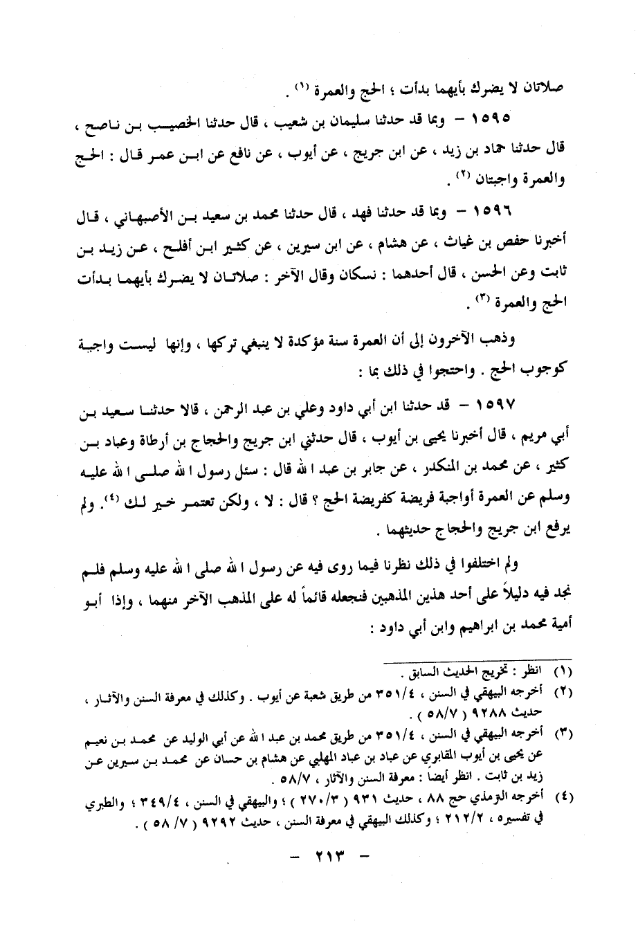 1596 - وَبِمَا قَدْ حَدَّثَنَا فَهْدٌ، قَالَ: حَدَّثَنَا مُحَمَّدُ بْنُ سَعِيدٍ الْأَصْبَهَانِيُّ، قَالَ: أَخْبَرَنَا حَفْصُ بْنُ غِيَاثٍ، عَنْ هِشَامٍ، عَنِ ابْنِ سِيرِينَ، عَنْ كَثِيرِ بْنِ أَفْلَحَ، عَنْ زَيْدِ بْنِ ثَابِتٍ، وَعَنِ الْحَسَنِ، قَالَ أَحَدُهُمَا: " نُسُكَانِ "، وَقَالَ الْآخَرُ: " صَلَاتَانِ لَا يَضُرُّكَ بِأَيِّهِمَا بَدَأْتَ: الْحَجُّ، وَالْعُمْرَةُ " وَذَهَبَ الْآخَرُونَ إِلَى أَنَّ الْعُمْرَةَ سُنَّةٌ مُؤَكَّدَةٌ لَا يَنْبَغِي تَرْكُهَا،