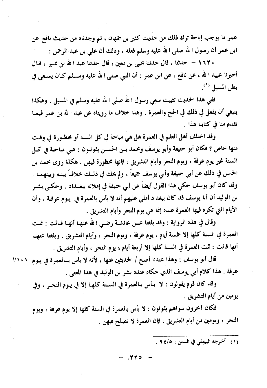 1620 - عَلِيُّ بْنُ عَبْدِ الرَّحْمَنِ، حَدَّثَنَا، قَالَ: حَدَّثَنَا يَحْيَى بْنُ مَعِينٍ، قَالَ: حَدَّثَنَا عَبْدُ اللهِ بْنُ نُمَيْرٍ، قَالَ: أَخْبَرَنَا عُبَيْدُ اللهِ، عَنْ نَافِعٍ، عَنِ ابْنِ عُمَرَ، " أَنَّ النَّبِيَّ صَلَّى اللَّهُ عَلَيْهِ وَسَلَّمَ كَانَ يَسْعَى فِي بَطْنِ الْمَسِيلِ " فَفِي هَذَا الْحَدِيثِ تَثْبِيتُ سَعْيِ رَسُولِ اللهِ صَلَّى اللَّهُ عَلَيْهِ وَسَلَّمَ فِي الْمَسِيلِ، وَهَكَذَا يَنْبَغِي أَنْ يُفْعَلَ فِي ذَلِكَ فِي الْحَجِّ وَالْعُمْرَةِ وَهَذَا خِلَافُ مَا رُوِّينَاهُ عَنْ عَبْدِ اللهِ بْنِ عُمَرَ فِيمَا تَقَدَّمَ مِنَّا فِي كِتَابِنَا هَذَا وَقَدِ اخْتَلَفَ أَهْلُ الْعِلْمِ فِي الْعُمْرَةِ، هَلْ هِيَ مُبَاحَةٌ فِي كُلِّ السَّنَةِ أَوْ مَحْظُورَةٌ فِي وَقْتٍ مِنْهَا خَاصٍّ؟ فَكَانَ أَبُو حَنِيفَةَ، وَأَبُو يُوسُفَ، وَمُحَمَّدُ بْنُ الْحَسَنِ يَقُولُونَ: هِيَ مُبَاحَةٌ فِي كُلِّ السَّنَةِ غَيْرَ يَوْمِ عَرَفَةَ، وَيَوْمِ النَّحْرِ، وَأَيَّامِ التَّشْرِيقِ، فَإِنَّهَا مَحْظُورَةٌ فِيهِنَّ هَكَذَا رَوَى مُحَمَّدُ بْنُ الْحَسَنِ فِي ذَلِكَ، عَنْ أَبِي حَنِيفَةَ، وَأَبِي يُوسُفَ جَمِيعًا، وَلَمْ يَحْكِ فِي ذَلِكَ خِلَافًا بَيْنَهُ وَبَيْنَهُمَا وَقَدْ كَانَ أَبُو يُوسُفَ حَكَى هَذَا الْقَوْلَ أَيْضًا عَنْ أَبِي حَنِيفَةَ فِي إِمْلَائِهِ بِبَغْدَادَ، وَحَكَى بِشْرُ بْنُ الْوَلِيدِ، أَنَّ أَبَا يُوسُفَ قَدْ كَانَ بِبَغْدَادَ أَمْلَى عَلَيْهِمْ أَنَّهُ لَا بَأْسَ بِالْعُمْرَةِ فِي يَوْمِ عَرَفَةَ، وَأَنَّ الْأَيَّامَ الَّتِي تُكْرَهُ فِيهَا الْعُمْرَةُ عِنْدَهُ إِنَّمَا هِيَ يَوْمُ النَّحْرِ وَأَيَّامُ التَّشْرِيقِ وَقَالَ فِي هَذِهِ الرِّوَايَةِ: وَقَدْ بَلَغَنَا عَنْ عَائِشَةَ رَضِيَ اللهُ عَنْهَا، أَنَّهَا قَالَتْ: تَمَّتِ الْعُمْرَةُ فِي السَّنَةِ كُلِّهَا إِلَّا خَمْسَةَ أَيَّامٍ: يَوْمَ عَرَفَةَ، وَيَوْمَ النَّحْرِ، وَأَيَّامَ التَّشْرِيقِ وَبَلَغَنَا عَنْهَا أَنَّهَا قَالَتْ: تَمَّتِ الْعُمْرَةُ فِي السَّنَةِ
