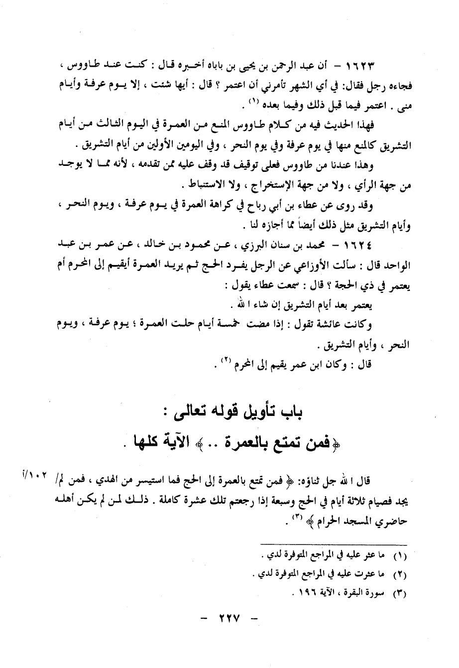 1623 - َأنَّ عَبْدَ الرَّحْمَنِ بْنَ يَحْيَى بْنِ بَابَاهَ أَخْبَرَهُ، قَالَ: كُنْتُ عِنْدَ طَاوُسٍ، فَجَاءَهُ رَجُلٌ، فَقَالَ: فِي أَيِّ الشَّهْرِ تَأْمُرُنِي أَنْ أَعْتَمِرَ؟ قَالَ " أَيِّهَا شِئْتَ، إِلَّا يَوْمَ عَرَفَةَ، وَأَيَّامَ مِنًى، اعْتَمِرْ فِيمَا قَبْلَ ذَلِكَ، وَفِيمَا بَعْدَهُ " فَهَذَا الْحَدِيثُ فِيهِ مِنْ كَلَامِ طَاوُسٍ الْمَنْعُ مِنَ الْعُمْرَةِ فِي الْيَوْمِ الثَّالِثِ مِنْ أَيَّامِ التَّشْرِيقِ كَالْمَنْعِ مِنْهَا فِي يَوْمِ عَرَفَةَ، وَفِي يَوْمِ النَّحْرِ، وَفِي الْيَوْمَيْنِ الْأَوَّلَيْنِ مِنْ أَيَّامِ التَّشْرِيقِ وَهَذَا عِنْدَنَا مِنْ طَاوُسٍ فَعَلَى تَوْقيِفٍ قَدْ وُقِّفَ عَلَيْهِ مِمَّنْ تَقَدَّمَهُ، لِأَنَّهُ مِمَّا لَا يُوجَدُ مِنْ جِهَةِ الرَّأْيِ، وَلَا مِنْ جِهَةِ الِاسْتِخْرَاجِ، وَلَا الِاسْتِنْبَاطِ وَقَدْ رُوِيَ عَنْ عَطَاءِ بْنِ أَبِي رَبَاحٍ فِي كَرَاهَةِ الْعُمْرَةِ فِي يَوْمِ عَرَفَةَ، وَيَوْمِ النَّحْرِ، وَأَيَّامِ التَّشْرِيقِ مِثْلُ ذَلِكَ أَيْضًا مِمَّا