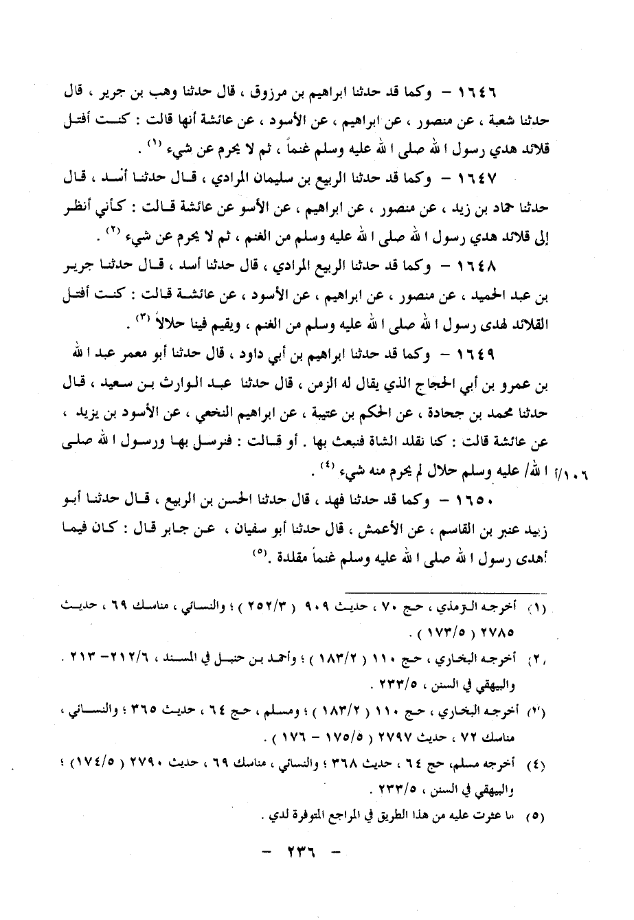 1649 - وَكَمَا قَدْ حَدَّثَنَا إِبْرَاهِيمُ بْنُ أَبِي دَاوُدَ، قَالَ: حَدَّثَنَا أَبُو مَعْمَرٍ عَبْدُ اللهِ بْنُ عَمْرِو بْنِ أَبِي الْحَجَّاجِ، الَّذِي يُقَالُ لَهُ: الزَّمنُ، قَالَ: حَدَّثَنَا عَبْدُ الْوَارِثِ بْنُ سَعِيدٍ، قَالَ: حَدَّثَنَا مُحَمَّدُ بْنُ جُحَادَةَ، عَنِ الْحَكَمِ بْنِ عُتَيْبَةَ، عَنْ إِبْرَاهِيمَ النَّخَعِيِّ، عَنِ الْأَسْوَدِ بْنِ يَزِيدَ، عَنْ عَائِشَةَ، قَالَتْ: " كُنَّا نُقَلِّدُ الشَّاةَ فَنَبْعَثُ بِهَا، أَوْ قَالَتْ: فَنُرْسِلُ بِهَا، وَرِسُولُ اللهِ صَلَّى اللَّهُ عَلَيْهِ وَسَلَّمَ حَلَالٌ لَمْ يَحْرُمْ مِنْهُ شَيْءٌ "