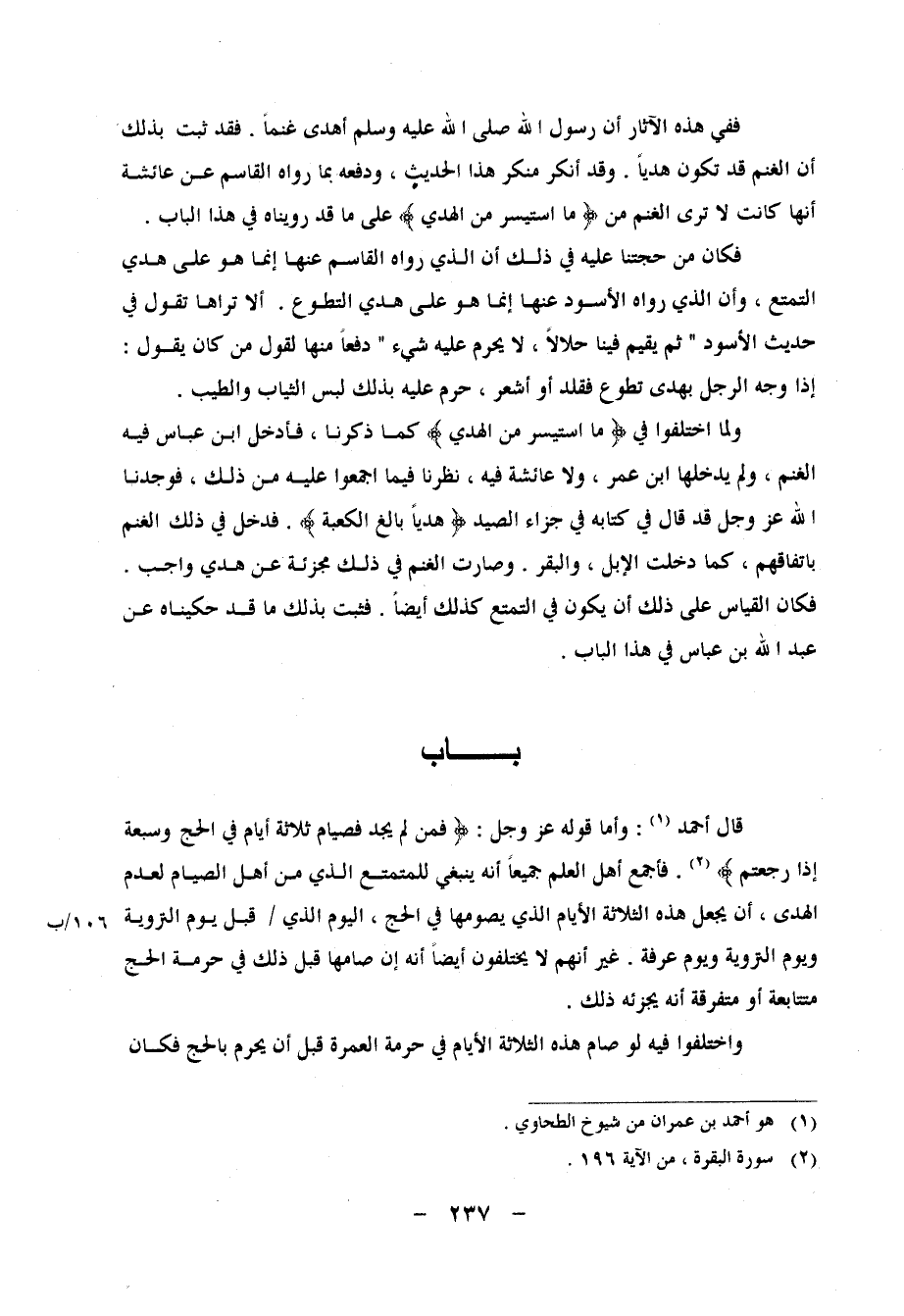 ، حَرُمَ عَلَيْهِ بِذَلِكَ لَبْسُ الثِّيَابِ وَالطِّيبُ وَلَمَّا اخْتَلَفُوا فِي: {مَا اسْتَيْسَرَ مِنَ الْهَدْيِ} كَمَا ذَكَرْنَا، فَأَدْخَلَ ابْنُ عَبَّاسٍ فِيهِ الْغَنَمَ، وَلَمْ يُدْخِلْهَا ابْنُ عُمَرَ، وَلَا عَائِشَةُ فِيهِ، نَظَرْنَا فِيمَا أَجْمَعُوا عِلَيْهِ مِنْ ذَلِكَ، فَوَجَدْنَا اللهَ عَزَّ وَجَلَّ قَدْ قَالَ فِي كِتَابِهِ فِي جَزَاءِ الصَّيْدِ: {هَدْيًا بَالِغَ الْكَعْبَةِ} ، فَدَخَلَ فِي ذَلِكَ الْغَنَمُ بِاتِّفَاقِهِمْ، كَمَا دَخَلَتِ الْإِبِلُ، وَالْبَقَرُ وَصَارَتِ الْغَنَمُ فِي ذَلِكَ مُجْزِئَةٌ عَنْ هَدْيٍ وَاجِبٍ فَكَانَ الْقِيَاسُ عَلَى ذَلِكَ أَنْ يَكُونَ فِي التَّمَتُّعِ كَذَلِكَ أَيْضًا، فَثَبَتَ بِذَلِكَ مَا قَدْ حَكَيْنَاهُ عَنْ عَبْدِ اللهِ بْنِ عَبَّاسٍ فِي هَذَا الْبَابِ بَابٌ قَالَ أَحْمَدُ: وَأَمَّا قَوْلُهُ عَزَّ وَجَلَّ: {فَمَنْ لَمْ يَجِدْ فَصِيَامُ ثَلاثَةِ أَيَّامٍ فِي الْحَجِّ وَسَبْعَةٍ إِذَا رَجَعْتُمْ} ، فَأَجْمَعَ أَهْلُ الْعِلْمِ جَمِيعًا أَنَّهُ يَنْبَغِي لِلْمُتَمَتِّعِ الَّذِي مِنْ أَهْلِ الصِّيَامِ لِعَدَمِ الْهَدْيِ، أَنْ يَجْعَلَ هَذِهِ الثَّلَاثَةَ الْأَيَّامَ الَّذِي يَصُومُهَا فِي الْحَجِّ: الْيَوْمَ الَّذِي قَبْلَ يَوْمِ التَّرْوِيَةِ، وَيَوْمَ التَّرْوِيَةِ، وَيَوْمَ عَرَفَةَ، غَيْرَ أَنَّهُمْ لَا يَخْتَلِفُونَ أَيْضًا أَنَّهُ إِنْ صَامَهَا قَبْلَ ذَلِكَ فِي حُرْمَةِ الْحَجِّ مَتَتَابِعَةً أَوْ مُتَفَرِّقَةً أَنَّهُ يُجْزِئُهُ ذَلِكَ وَاخْتَلَفُوا فِيهِ لَوْ صَامَ هَذِهِ الثَّلَاثَةَ الْأَيَّامَ فِي حُرْمَةِ الْعُمْرَةِ قَبْلَ أَنْ يُحْرِمَ بِالْحَجِّ، فَكَانَ