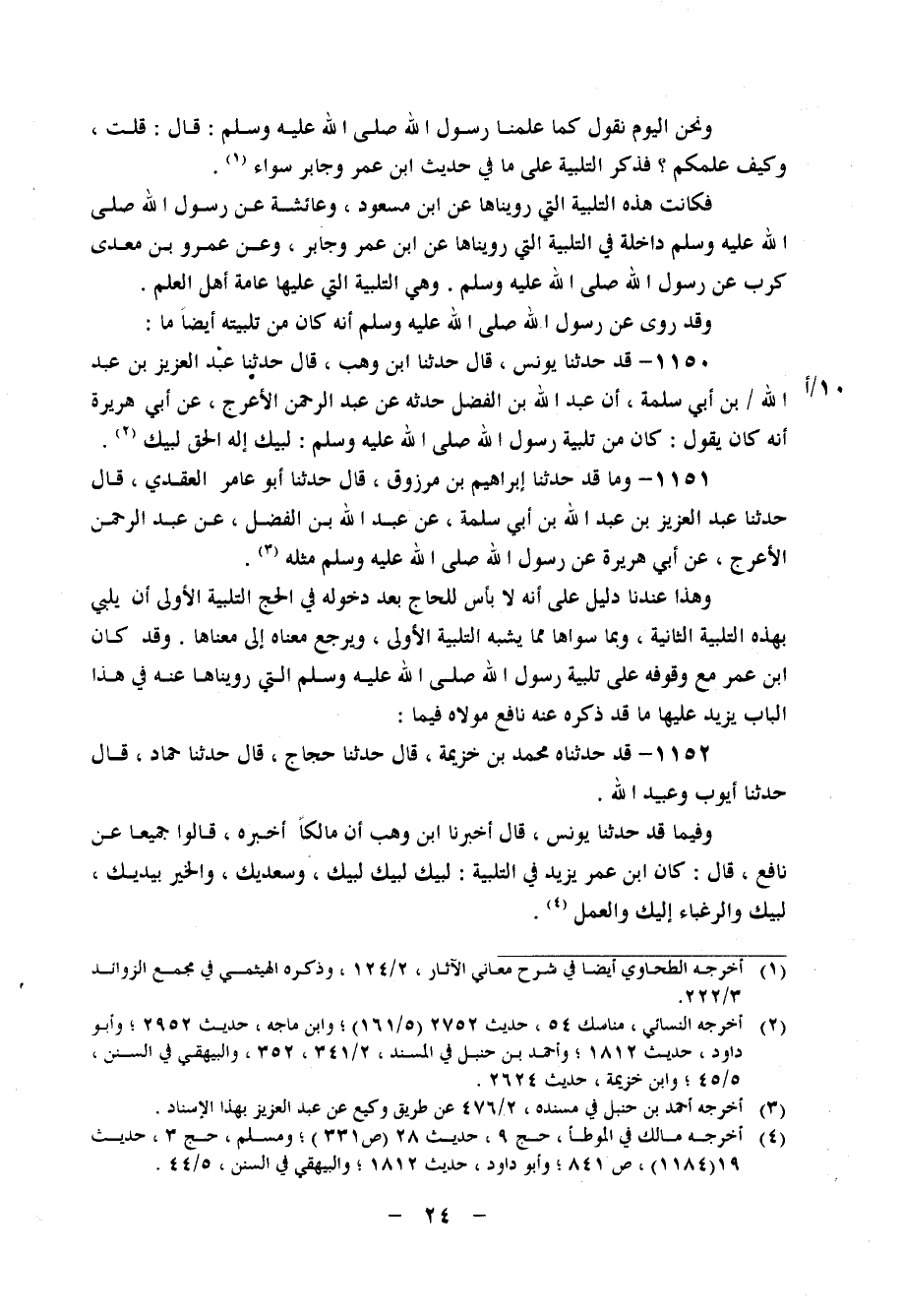 1152 - قَدْ حَدَّثَنَاهُ مُحَمَّدُ بْنُ خُزَيْمَةَ، قَالَ: حَدَّثَنَا حَجَّاجٌ، قَالَ: حَدَّثَنَا حَمَّادٌ، قَالَ: حَدَّثَنَا أَيُّوبُ، وَعُبَيْدُ اللهِ وَفِيمَا قَدْ حَدَّثَنَا يُونُسُ، قَالَ: أَخْبَرَنَا ابْنُ وَهْبٍ، أَنَّ مَالِكًا، أَخْبَرَهُ، قَالُوا جَمِيعًا عَنْ نَافِعٍ، قَالَ: " كَانَ ابْنُ عُمَرَ يَزِيدُ فِي التَّلْبِيَةِ: لَبَّيْكَ لَبَّيْكَ لَبَّيْكَ، وَسَعْدَيْكَ، وَالْخَيْرُ بِيَدَيْكَ، لَبَّيْكَ وَالرَّغْبَاءُ إِلَيْكَ وَالْعَمَلُ "