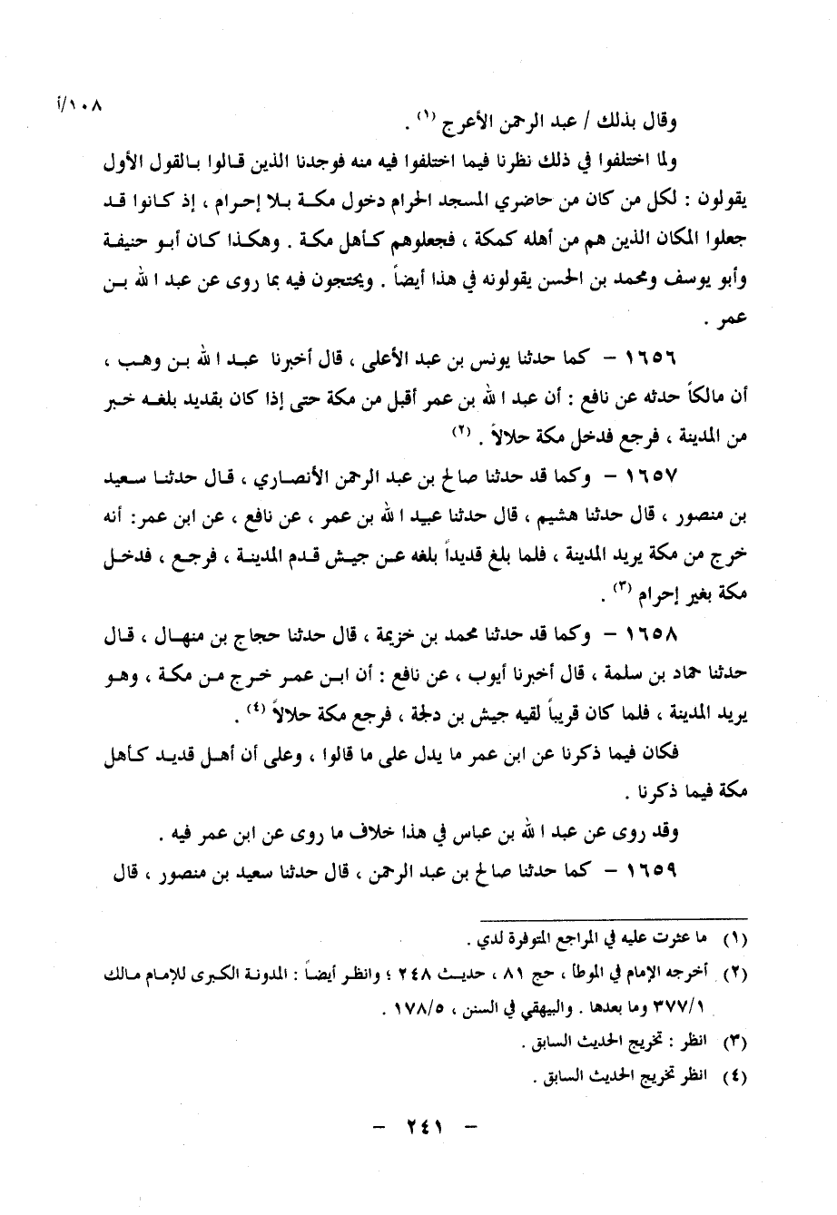 وَقَالَ بِذَلِكَ عَبْدُ الرَّحْمَنِ الْأَعْرَجُ وَلَمَّا اخْتَلَفُوا فِي ذَلِكَ نَظَرْنَا فِيمَا اخْتَلَفُوا فِيهِ مِنْهُ، فَوَجَدْنَا الَّذِينَ قَالُوا بِالْقَوْلِ الْأَوَّلِ يَقُولُونَ: لِكُلِّ مَنْ كَانَ حَاضِرِي الْمَسْجِدِ الْحَرَامِ دُخُولُ مَكَّةَ بِلَا إِحْرَامٍ، إِذْ كَانُوا قَدْ جَعَلُوا الْمَكَانَ الَّذِينَ هُمْ مِنْ أَهْلِهِ كَمَكَّةَ، فَجَعَلُوهُمْ كَأَهْلِ مَكَّةَ، وَهَكَذَا كَانَ أَبُو حَنِيفَةَ، وَأَبُو يُوسُفَ، وَمُحَمَّدُ بْنُ الْحَسَنِ يَقُولُونَهُ فِي هَذَا أَيْضًا، وَيَحْتَجُّونَ فِيهِ بِمَا رُوِيَ عَنْ عَبْدِ اللهِ بْنِ عُمَرَ