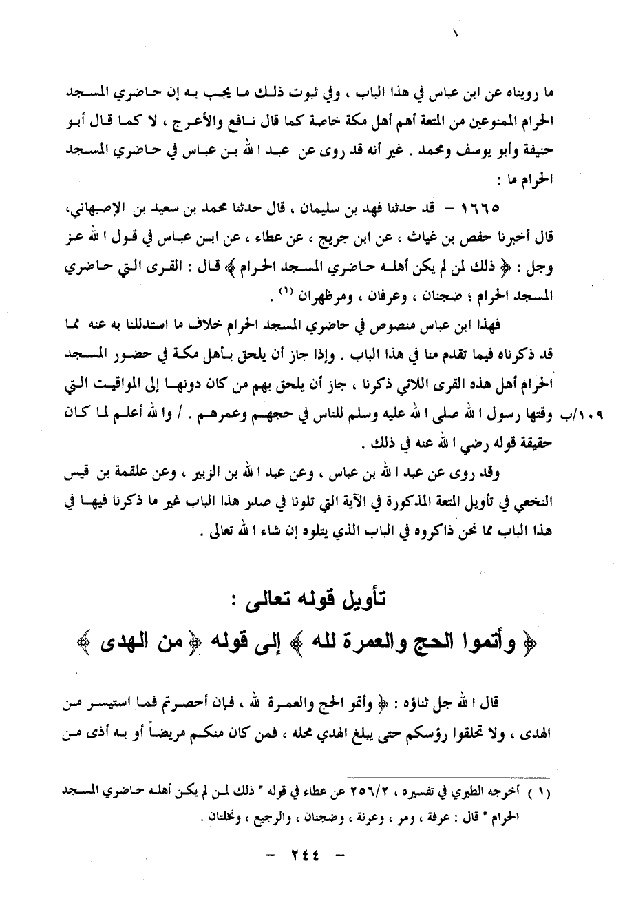 1665 - قَدْ حَدَّثَنَا فَهْدُ بْنُ سُلَيْمَانَ، قَالَ: حَدَّثَنَا مُحَمَّدُ بْنُ سَعِيدِ بْنِ الْأَصْبَهَانِيِّ، قَالَ: أَخْبَرَنَا حَفْصُ بْنُ غِيَاثٍ، عَنِ ابْنِ جُرَيْجٍ، عَنْ عَطَاءٍ، عَنِ ابْنِ عَبَّاسٍ، فِي قَوْلِ اللهِ عَزَّ وَجَلَّ: " {ذَلِكَ لِمَنْ لَمْ يَكُنْ أَهْلُهُ حَاضِرِي الْمَسْجِدِ الْحَرَامِ} ، قَالَ: الْقُرَى الَّتِي حَاضِرِي الْمَسْجِدِ الْحَرَامِ: ضَجْنَانُ، وَعِرْفَانٌ، وَمَرُّ ظَهْرَانَ " فَهَذَا ابْنُ عَبَّاسٍ مَنْصُوصٌ فِي حَاضِرِي الْمَسْجِدِ الْحَرَامِ خِلَافُ مَا اسْتَدْلَلْنَا بِهِ عَنْهُ مِمَّا قَدْ ذَكَرْنَاهُ فِيمَا تَقَدَّمَ مِنَّا فِي هَذَا الْبَابِ وَإِذَا جَازَ أَنْ يَلْحَقَ بِأَهْلِ مَكَّةَ فِي حُضُورِ الْمَسْجِدِ الْحَرَامِ أَهْلُ هَذِهِ الْقُرَى اللَّائِي ذَكَرْنَا، جَازَ أَنْ يَلْحَقَ بِهِمْ مَنْ كَانَ دُونَهَا إِلَى الْمَوَاقِيتِ الَّتِي وَقَّتَهَا رَسُولُ اللهِ صَلَّى اللَّهُ عَلَيْهِ وَسَلَّمَ لِلنَّاسِ فِي حَجِّهِمْ وَعُمَرِهِمْ، وَاللهُ أَعْلَمُ لِمَا كَانَ حَقِيقَةُ قَوْلِهِ رَضِيَ اللهُ عَنْهُ فِي ذَلِكَ وَقَدْ رُوِيَ عَنْ عَبْدِ اللهِ بْنِ عَبَّاسٍ، وَعَنْ عَبْدِ اللهِ بْنِ الزُّبَيْرِ، وَعَنْ عَلْقَمَةَ بْنِ قَيْسٍ النَّخَعِيِّ، فِي تَأْوِيلِ الْمُتْعَةِ الْمَذْكُورَةِ فِي الْآيَةِ الَّتِي تَلَوْنَا فِي صَدْرِ هَذَا الْبَابِ، غَيْرُ مَا ذَكَرْنَا فِيهَا فِي هَذَا الْبَابِ مِمَّا نَحْنُ ذَاكِرُوهُ فِي الْبَابِ الَّذِي يَتْلُوهُ إِنْ شَاءَ اللهُ تَعَالَى