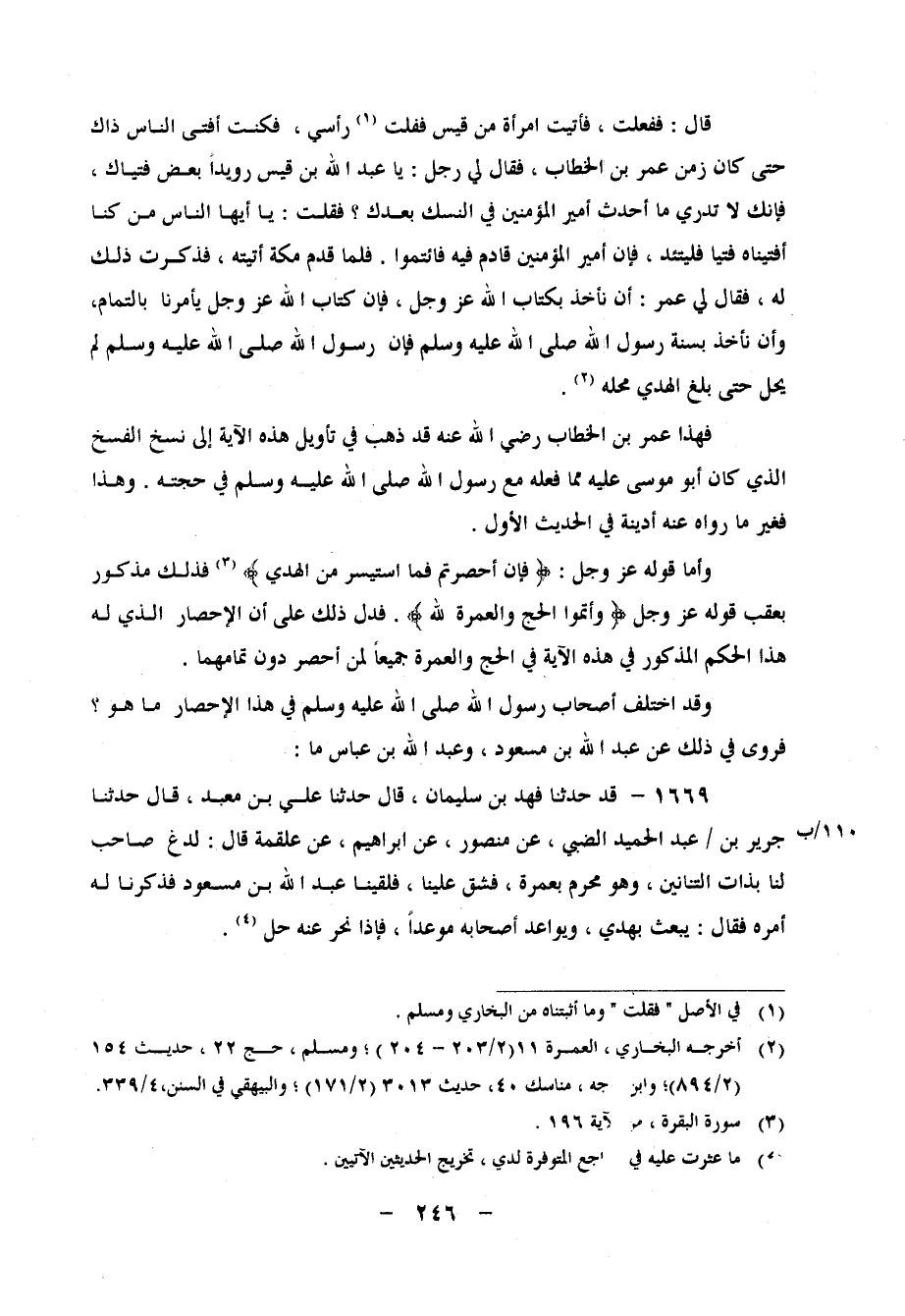 قَالَ: فَفَعَلْتُ، فَأَتَيْتُ امْرَأَةً مِنْ قَيْسٍ، فَفَلَّتْ رَأْسِي، فَكُنْتُ أُفْتِي النَّاسَ ذَاكَ حَتَّى كَانَ زَمَنُ عُمَرَ بْنِ الْخَطَّابِ، فَقَالَ لِي رَجُلٌ: يَا عَبْدَ اللهِ بْنَ قَيْسٍ، رُوَيْدًا بَعْضَ فُتْيَاكَ، فَإِنَّكَ لَا تَدْرِي مَا أَحْدَثَ أَمِيرُ الْمُؤْمِنِينَ فِي النُّسُكِ بَعْدَكَ فَقُلْتُ: يَا أَيُّهَا النَّاسُ، مَنْ كُنَّا أَفْتَيْنَاهُ فُتْيَا فَلْيَتَّئِدْ، فَإِنَّ أَمِيرَ الْمُؤْمِنِينَ قَادِمٌ فِيهِ، فَائْتَمُّوا فَلَمَّا قَدِمَ مَكَّةَ أَتَيْتُهُ، فَذَكَرْتُ ذَلِكَ لَهُ، فَقَالَ لِي عُمَرُ: أَنْ نَأْخُذَ بِكِتَابِ اللهِ عَزَّ وَجَلَّ، فَإِنَّ كِتَابَ اللهِ عَزَّ وَجَلَّ يِأْمُرُنَا بِالتَّمَامِ، وَأَنْ نَأْخُذَ بِسُنَّةِ رَسُولِ اللهِ صَلَّى اللَّهُ عَلَيْهِ وَسَلَّمَ، فَإِنَّ رَسُولَ اللهِ صَلَّى اللَّهُ عَلَيْهِ وَسَلَّمَ لَمْ يَحِلَّ حَتَّى بَلَغَ الْهَدْيُ مَحِلَّهُ فَهَذَا عُمَرُ بْنُ الْخَطَّابِ رَضِيَ اللهُ عَنْهُ قَدْ ذَهَبَ فِي تَأْوِيلِ هَذِهِ الْآيَةِ إِلَى نَسْخِ