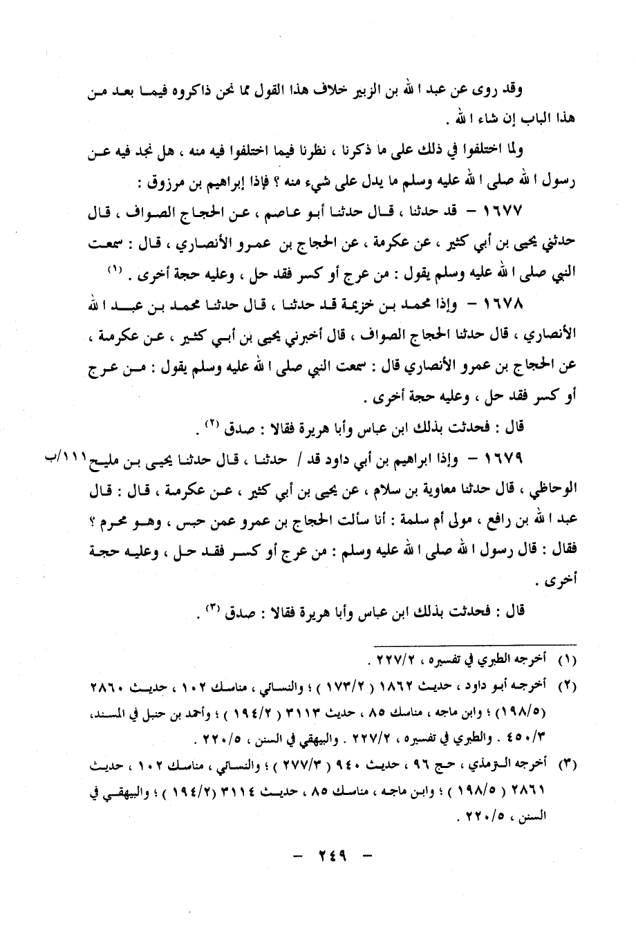 1678 - وَإِذَا مُحَمَّدُ بْنُ خُزَيْمَةَ، قَدْ حَدَّثَنَا، قَالَ: حَدَّثَنَا مُحَمَّدُ بْنُ عَبْدِ اللهِ الْأَنْصَارِيُّ، قَالَ: حَدَّثَنَا الْحَجَّاجُ الصَّوَّافُ، قَالَ: أَخْبَرَنِي يَحْيَى بْنُ أَبِي كَثِيرٍ، عَنْ عِكْرِمَةَ، عَنِ الْحَجَّاجِ بْنِ عَمْرٍو الْأَنْصَارِيِّ، قَالَ: سَمِعْتُ النَّبِيَّ صَلَّى اللَّهُ عَلَيْهِ وَسَلَّمَ، يَقُولُ: " مَنْ عَرِجَ أَوْ كُسِرَ فَقَدْ حَلَّ، وَعَلَيْهِ حَجَّةٌ أُخْرَى " قَالَ: فَحَدَّثْتُ بِذَلِكَ ابْنَ عَبَّاسٍ، وَأَبَا هُرَيْرَةَ، فَقَالَا: صَدَقَ
