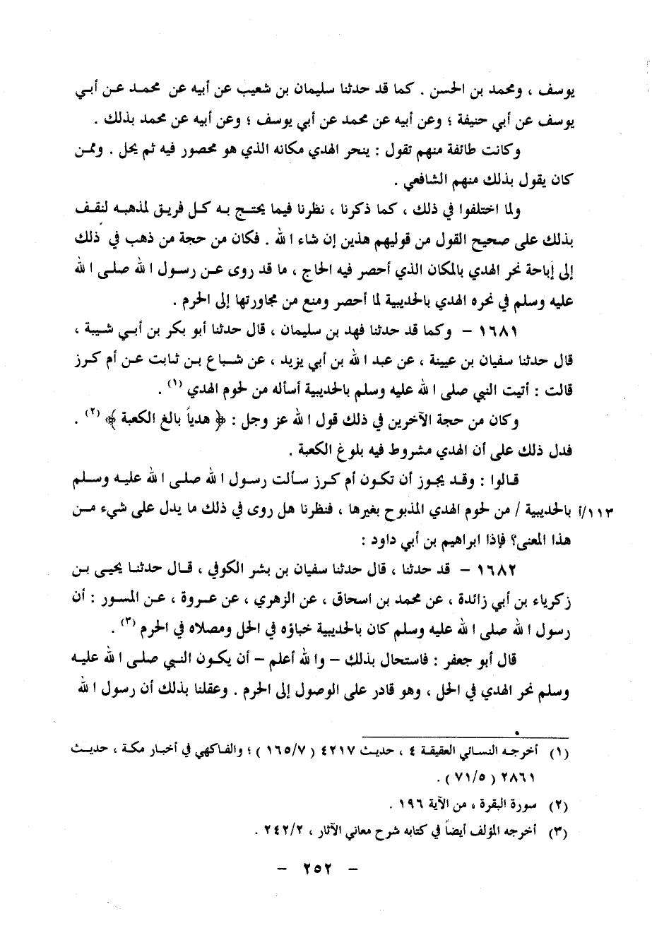 يُوسُفَ، وَمُحَمَّدُ بْنُ الْحَسَنِ، كَمَا قَدْ حَدَّثَنَا سُلَيْمَانُ بْنُ شُعَيْبٍ، عَنْ أَبِيهِ، عَنْ مُحَمَّدٍ، عَنْ أَبِي يُوسُفَ، عَنْ أَبِي حَنِيفَةَ، وَعَنْ أَبِيهِ، عَنْ مُحَمَّدٍ، عَنْ أَبِي يُوسُفَ، وَعَنْ أَبِيهِ، عَنْ مُحَمَّدٍ، بِذَلِكَ وَكَانَتْ طَائِفَةٌ مِنْهُمْ تَقُولُ: يُنْحَرُ الْهَدْيُ مَكَانَهُ الَّذِي هُوَ مَحْصُورٌ فِيهِ ثُمَّ يَحِلُّ وَمِمَّنْ كَانَ يَقُولُ بِذَلِكَ مِنْهُمُ الشَّافِعِيُّ وَلَمَّا اخْتَلَفُوا فِي ذَلِكَ، كَمَا ذَكَرْنَا، نَظَرْنَا فِيمَا يَحْتَجُّ بِهِ كُلُّ فَرِيُقٍ لِمَذْهَبِهِ لِنَقِفَ بِذَلِكَ عَلَى صَحِيحِ الْقَوْلِ مِنْ قَوْلَيْهِمْ هَذَيْنِ إِنْ شَاءَ اللهُ فَكَانَ مِنْ حُجَّةِ مَنْ ذَهَبَ