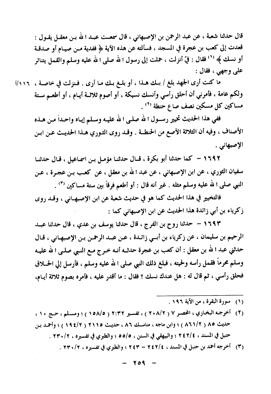 1693 - حَدَّثَنَا رَوْحُ بْنُ الْفَرَجِ، قَالَ: حَدَّثَنَا يُوسُفُ بْنُ عَدِيٍّ، قَالَ: حَدَّثَنَا عَبْدُ الرَّحِيمِ بْنُ سُلَيْمَانَ، عَنْ زَكَرِيَّاءَ بْنِ أَبِي زَائِدَةَ، عَنْ عَبْدِ الرَّحْمَنِ بْنِ الْأَصْبَهَانِيِّ، قَالَ: حَدَّثَنِي عَبْدُ اللهِ بْنُ مَعْقِلٍ، أَنَّ كَعْبَ بْنَ عُجْرَةَ، حَدَّثَهُ أَنَّهُ خَرَجَ مَعَ النَّبِيِّ صَلَّى اللَّهُ عَلَيْهِ وَسَلَّمَ مُحْرِمًا، فَقَمِلَ رَأْسُهُ وَلِحْيَتُهُ، فَبَلَغَ ذَلِكَ النَّبِيَّ صَلَّى اللِّهُ عَلَيْهِ وَسَلَّمَ، فَأَرْسَلَ إِلَيَّ الْحَلَّاقَ، فَحَلَقَ رَأْسِي، ثُمَّ قَالَ لَهُ: " هَلْ عِنْدَكَ نُسُكٌ؟ " فَقَالَ: مَا أَقْدِرُ عَلَيْهِ، فَأَمَرَهُ بِصَوْمِ ثَلَاثَةِ أَيَّامٍ،