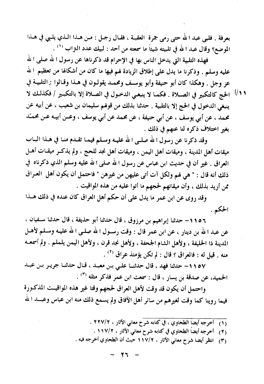 بِعَرَفَةَ، فَلَبَّى عَبْدُ اللهِ حَتَّى رَمَى جَمَرَةَ الْعَقَبَةِ، فَقَالَ رَجُلٌ: مَنْ هَذَا الَّذِي يُلَبِّي فِي هَذَا الْمَوْضِعِ؟ وَقَالَ عَبْدُ اللهِ فِي تَلْبِيَتِهِ شَيْئًا مَا سَمِعْتُهُ مِنْ أَحَدٍ: " لَبَّيْكَ عَدَدَ التُّرَابِ " فَهَذِهِ التَّلْبِيَةُ الَّتِي يَدْخُلُ النَّاسُ بِهَا فِي الْإِحْرِامِ قَدْ ذَكَرْنَاهَا عَنْ رَسُولِ اللهِ صَلَّى اللَّهُ عَلَيْهِ وَسَلَّمَ، وَذَكَرْنَا مَا يَدُلُّ عَلَى إِطْلَاقِ الزِّيَادَةِ لَهُمْ فِيهَا مَا كَانَ مِنْ أَشْكَالِهَا مِنْ تَعْظِيمِ اللهِ عَزَّ وَجَلَّ وَهَكَذَا كَانَ أَبُو حَنِيفَةَ، وَأَبُو يُوسُفَ، وَمُحَمَّدٌ يَقُولُونَ فِي هَذَا، وَقَالُوا: التَّلْبِيَةُ فِي الْحَجِّ كَالتَّكْبِيرِ فِي الصَّلَاةِ، فَكَمَا لَا يَنْبَغِي الدُّخُولُ فِي الصَّلَاةِ إِلَّا بِالتَّكْبِيرِ، فَكَذَلِكَ لَا يَنْبَغِي الدُّخُولُ فِي الْحَجِّ إِلَّا بِالتَّلْبِيَةِ، حَدَّثَنَا بِذَلِكَ مِنْ قَوْلِهِمْ سُلَيْمَانُ بْنُ شُعَيْبٍ، عَنْ أَبِيهِ، عَنْ مُحَمَّدٍ، عَنْ أَبِي يُوسُفَ، عَنْ أَبِي حَنِيفَةَ، عَنْ مُحَمَّدٍ، عَنْ أَبِي يُوسُفَ، وَعَنْ أَبِيهِ، عَنْ مُحَمَّدٍ بِغَيْرِ اخْتِلَافٍ ذَكَرَهُ لَنَا عَنْهُمْ فِي ذَلِكَ وَقَدْ ذَكَرْنَا عَنْ رَسُولِ اللهِ صَلَّى اللَّهُ عَلَيْهِ وَسَلَّمَ فِيمَا تَقَدَّمَ مِنَّا فِي هَذَا الْبَابِ مِيقَاتَ أَهْلِ الْمَدِينَةِ، وَمِيقَاتَ أَهْلِ الْيَمَنِ، وَمِيقَاتَ أَهْلِ نَجْدٍ لِلْحَجِّ، وَلَمْ يُذْكَرْ مِيقَاتُ أَهْلِ الْعِرَاقِ، غَيْرَ أَنَّ فِي حَدِيثِ ابْنِ عَبَّاسٍ، عَنْ رَسُولِ اللهِ صَلَّى اللَّهُ عَلَيْهِ وَسَلَّمَ الَّذِي ذَكَرْنَاهُ فِي ذَلِكَ، أَنَّهُ قَالَ: " هِيَ لَهُمْ وَلِكُلِّ آتٍ