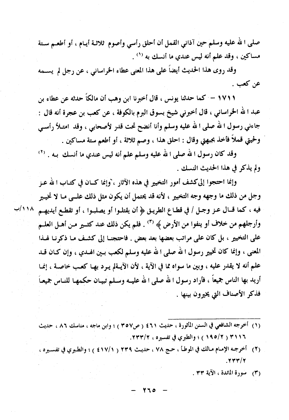 وَلَمْ يَذْكُرْ فِي هَذَا الْحَدِيثِ النُّسُكَ وَإِنَّمَا احْتَاجُوا إِلَى كَشْفِ أُمُورِ التَّخْيِيرِ فِي هَذِهِ الْآثَارِ، وَإِنَّمَا كَانَ فِي كِتَابِ اللهِ عَزَّ وَجَلَّ مِنْ ذَلِكَ مَا وَجْهُهُ وَجْهُ التَّخْيِيرِ، لِأَنَّهُ قَدْ يَحْتَمِلُ أَنْ يَكُونَ مِثْلُ ذَلِكَ عَلَى مَا لَا تَخْيِيرَ فِيهِ، كَمَا قَالَ عَزَّ وَجَلَّ فِي قُطَّاعِ الطَّرِيقِ: {أَنْ يُقَتَّلُوا أَوْ يُصَلَّبُوا أَوْ تُقَطَّعَ أَيْدِيهِمْ وَأَرْجُلُهُمْ مِنْ خِلافٍ أَوْ يُنْفَوْا مِنَ الأَرْضِ} ، فَلَمْ يَكُنْ ذَلِكَ عِنْدَ كَثِيرٍ مِنْ أَهْلِ الْعِلْمِ عَلَى التَّخْيِيرِ، بَلْ كَانَ عَلَى مَرَاتِبٍ بَعْضُهَا بَعْدَ بَعْضٍ فَاحْتَجْنَا إِلَى كَشْفِ مَا ذَكَرْنَا لِهَذَا الْمَعْنَى، وَإِنَّمَا كَانَ تَخْيِيرُ رَسُولِ اللهِ صَلَّى اللَّهُ عَلَيْهِ وَسَلَّمَ لِكَعْبٍ بَيْنَ الْهَدْيِ، وَإِنْ كَانَ قَدْ عَلِمَ أَنَّهُ لَا يَقْدِرُ عَلَيْهِ، وَبَيْنَ مَا سِوَاهُ مِمَّا فِي الْآيَةِ، لِأَنَّ الْآيَةَ لَمْ يُرَدْ بِهَا كَعْبٌ خَاصَّةً، إِنَّمَا أُرِيدَ بِهَا النَّاسُ جَمِيعًا، فَأَرَادَ رَسُولُ اللهِ صَلَّى اللَّهُ عَلَيْهِ وَسَلَّمَ تِبْيَانَ حُكْمِهَا لِلنَّاسِ جَمِيعًا، فَذَكَرَ الْأَصْنَافَ الَّتِي يُخَيَّرُونَ بَيْنَهَا