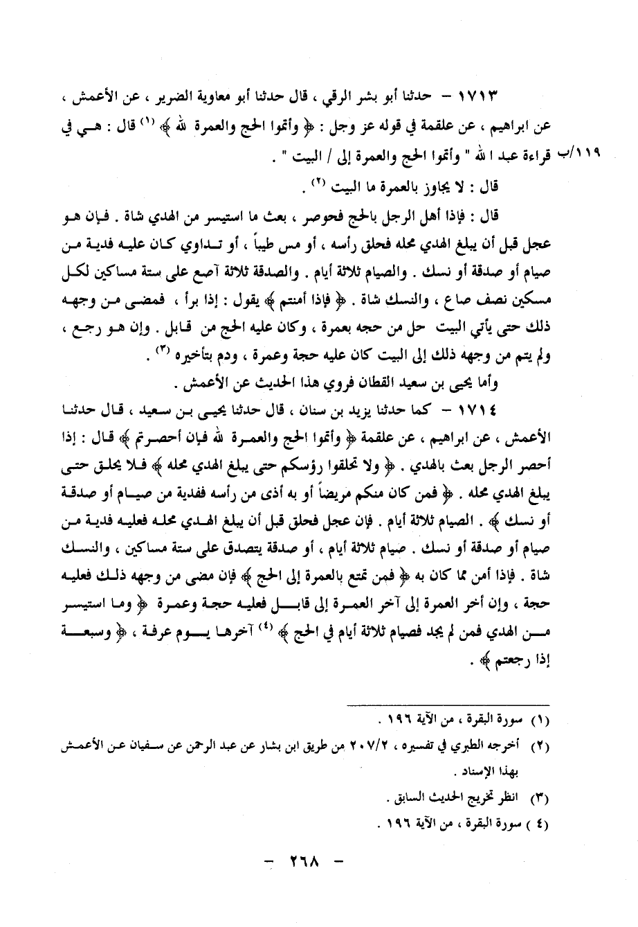 1713 - حَدَّثَنَا أَبُو بِشْرٍ الرَّقِّيُّ، قَالَ: حَدَّثَنَا أَبُو مُعَاوِيَةَ الضَّرِيرُ، عَنِ الْأَعْمَشِ، عَنْ إِبْرَاهِيمَ، عَنْ عَلْقَمَةَ، فِي قَوْلِهِ عَزَّ وَجَلَّ: {وَأَتِمُّوا الْحَجَّ وَالْعُمْرَةَ لِلَّهِ} ، قَالَ: هِيَ فِي قِرَاءَةِ عَبْدِ اللهِ " وَأَتِمُّوا الْحَجَّ وَالْعُمْرَةَ إِلَى الْبَيْتِ " قَالَ: لَا يُجَاوَزُ بِالْعُمْرَةِ مَا الْبَيْتُ قَالَ: فَإِذَا أَهَلَّ الرَّجُلُ بِالْحَجِّ فَحُوصِرَ، بَعَثَ مَا اسْتَيْسَرَ مِنَ الْهَدْيِ شَاةً، فَإِنْ هُوَ عَجِلَ قَبْلَ أَنْ يَبْلُغَ الْهَدْيُ مَحِلَّهُ، فَحَلَقَ رَأْسَهُ، أَوْ مَسَّ طِيبًا، أَوْ تَدَاوَى، كَانَ عَلَيْهِ فِدْيَةٌ مِنْ صِيَامٍ أَوْ صَدَقَةٍ أَوْ نُسُكٍ، وَالصِّيَامُ ثَلَاثَةُ أَيَّامٍ، وَالصَّدَقَةُ ثَلَاثَةُ آصُعٍ عَلَى سِتَّةِ مَسَاكِينَ لِكُلِّ مِسْكِينٍ نِصْفُ صَاعٍ، وَالنُّسُكُ شَاةٌ {فَإِذَا أَمِنْتُمْ} ، يَقُولُ: إِذَا بَرَأَ، فَمَضَى مِنْ وَجْهِهِ ذَلِكَ حَتَّى يَأْتِيَ الْبَيْتَ حَلَّ مِنْ حَجِّهِ بِعُمْرَةٍ، وَكَانَ عَلَيْهِ الْحَجُّ مِنْ قَابِلٍ، وَإِنْ هُوَ رَجَعَ، وَلَمْ يُتِمَّ مِنْ وَجْهِهِ ذَلِكَ إِلَى الْبَيْتِ كَانَ عَلَيْهِ حَجَّةٌ، وَعُمْرَةٌ، وَدَمٌ بِتَأْخِيرِهِ وَأَمَّا يَحْيَى بْنُ سَعِيدٍ الْقَطَّانُ، فَرَوَى هَذَا الْحَدِيثَ عَنِ الْأَعْمَشِ