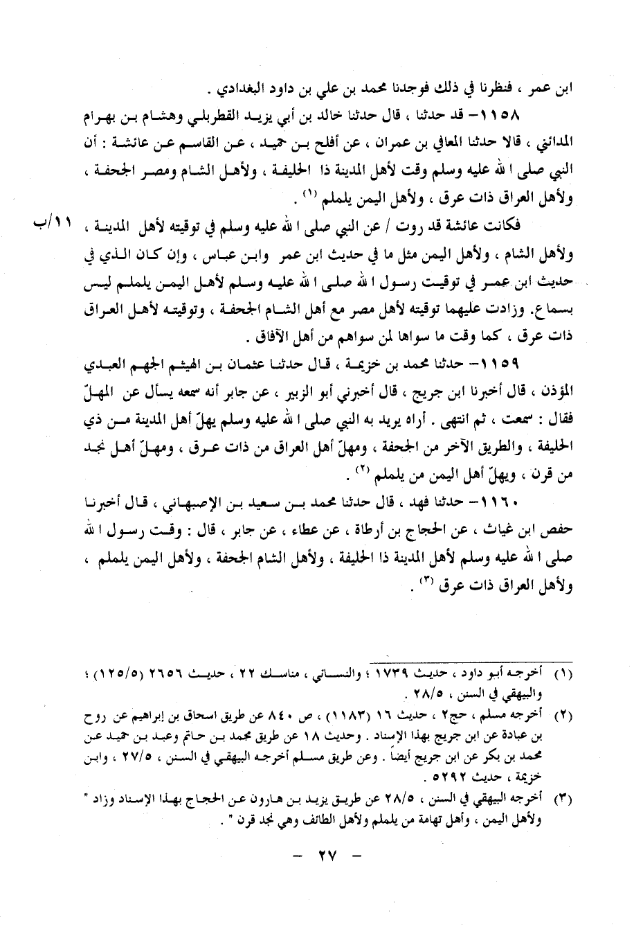 1158 - فَوَجَدْنَا مُحَمَّدَ بْنَ عَلِيِّ بْنِ دَاوُدَ الْبَغْدَادِيَّ، قَدْ حَدَّثَنَا، قَالَ: حَدَّثَنَا خَالِدُ بْنُ أَبِي يَزِيدَ القطربلِيُّ، وَهِشَامُ بْنُ بَهْرَامٍ الْمَدَائِنِيُّ، قَالَا: حَدَّثَنَا الْمُعَافَى بْنُ عِمْرَانَ، عَنْ أَفْلَحَ بْنِ حُمَيْدٍ، عَنِ الْقَاسِمِ، عَنْ عَائِشَةَ، أَنَّ النَّبِيَّ صَلَّى اللَّهُ عَلَيْهِ وَسَلَّمَ " وَقَّتَ لِأَهْلِ الْمَدِينَةِ ذَا الْحُلَيْفَةِ، وَلِأَهْلِ الشَّامِ وَمِصْرَ الْجُحْفَةَ، وَلِأَهْلِ الْعِرَاقِ ذَاتَ عِرْقٍ، وَلِأَهْلِ الْيَمَنِ يَلَمْلَمَ " فَكَانَتْ عَائِشَةُ قَدْ رَوَتْ عَنِ النَّبِيِّ صَلَّى اللَّهُ عَلَيْهِ وَسَلَّمَ فِي تَوْقِيتِهِ لِأَهْلِ الْمَدِينَةِ، وَلِأَهْلِ الشَّامِ، وَلِأَهْلِ الْيَمَنِ مِثْلَ مَا فِي حَدِيثِ ابْنِ عُمَرَ وَابْنِ عَبَّاسٍ، وَإِنْ كَانَ الَّذِي فِي حَدِيثِ ابْنِ عُمَرَ فِي تَوْقِيتِ رَسُولِ اللهِ صَلَّى اللَّهُ عَلَيْهِ وَسَلَّمَ لِأَهْلِ الْيَمَنِ يَلَمْلَمَ، لَيْسَ بِسَمَاعٍ، وَزَادَتْ عَلَيْهِمَا تَوْقِيتَهُ لِأَهْلِ مِصْرَ مَعَ أَهْلِ الشَّامِ الْجُحْفَةِ، وَتَوْقِيتَهُ لِأَهْلِ الْعِرَاقِ ذَاتِ عِرْقٍ كَمَا وَقَّتَ مَا سِوَاهَا لِمَنْ سِوَاهُمْ مِنْ أَهْلِ الْآفَاقِ