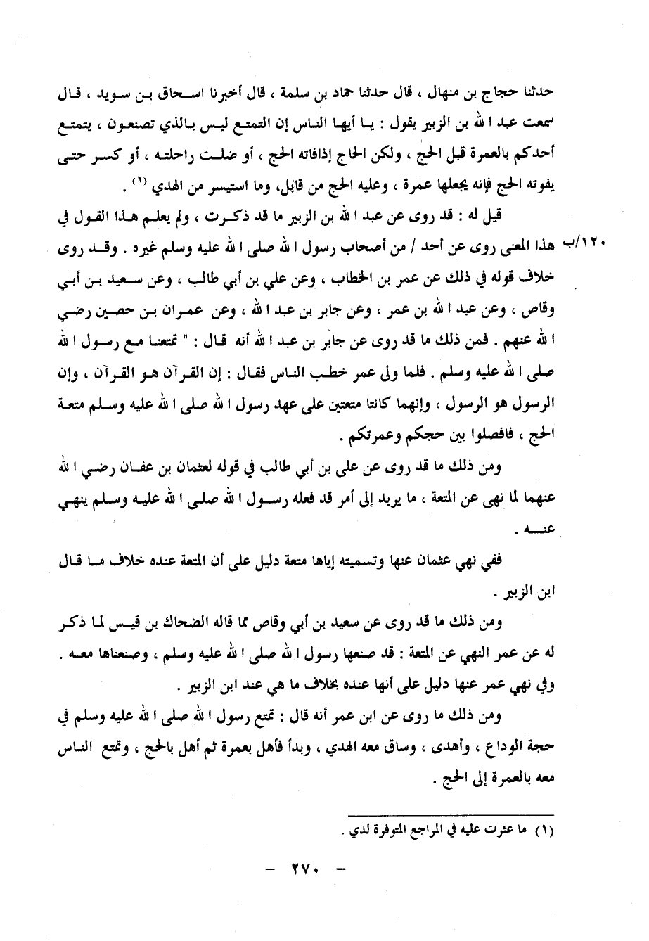 عَلِيِّ بْنِ أَبِي طَالِبٍ فِي قَوْلِهِ لِعُثْمَانَ بْنِ عَفَّانَ رَضِيَ اللهُ عَنْهُمَا لَمَّا نَهَى عَنِ الْمُتْعَةِ: مَا يُرِيدُ إِلَى أَمْرٍ قَدْ فَعَلَهُ رَسُولُ اللهِ صَلَّى اللَّهُ عَلَيْهِ وَسَلَّمَ يَنْهَى عَنْهُ فَفِي نَهْيِ عُثْمَانَ عَنْهَا، وَتَسْمِيَتِهِ إِيَّاهَا مُتْعَةً، دَلِيلٌ عَلَى أَنَّ الْمُتْعَةَ عِنْدَهُ خِلَافُ مَا قَالَ ابْنُ الزُّبَيْرِ وَمِنْ ذَلِكَ مَا قَدْ رُوِيَ عَنْ سَعِيدِ بْنِ أَبِي وَقَّاصٍ مِمَّا قَالَهُ الضَّحَّاكُ بْنُ قَيْسٍ لَمَّا ذُكِرَ لَهُ عَنْ عُمَرَ النَّهْيُ عَنِ الْمُتْعَةِ: قَدْ صَنَعَهَا رَسُولُ اللهِ صَلَّى اللَّهُ عَلَيْهِ وَسَلَّمَ، وَصَنَعْنَاهَا مَعَهُ وَفِي نَهْيِ عُمَرَ عَنْهَا دَلِيلٌ عَلَى أَنَّهَا عِنْدَهُ بِخِلَافِ مَا هِيَ عِنْدَ ابْنِ الزُّبَيْرِ وَمِنْ ذَلِكَ مَا رُوِيَ عَنِ ابْنِ عُمَرَ، أَنَّهُ قَالَ: تَمَتَّعَ رَسُولُ اللهِ صَلَّى اللَّهُ عَلَيْهِ وَسَلَّمَ فِي حَجَّةِ الْوَدَاعِ، وَأَهْدَى، وَسَاقَ مَعَهُ الْهَدْيَ، وَبَدَأَ فَأَهَلَّ بِعُمْرَةٍ، ثُمَّ أَهَلَّ بِالْحَجِّ، وَتَمَتَّعَ النَّاسُ مَعَهُ بِالْعُمْرَةِ إِلَى الْحَجِّ