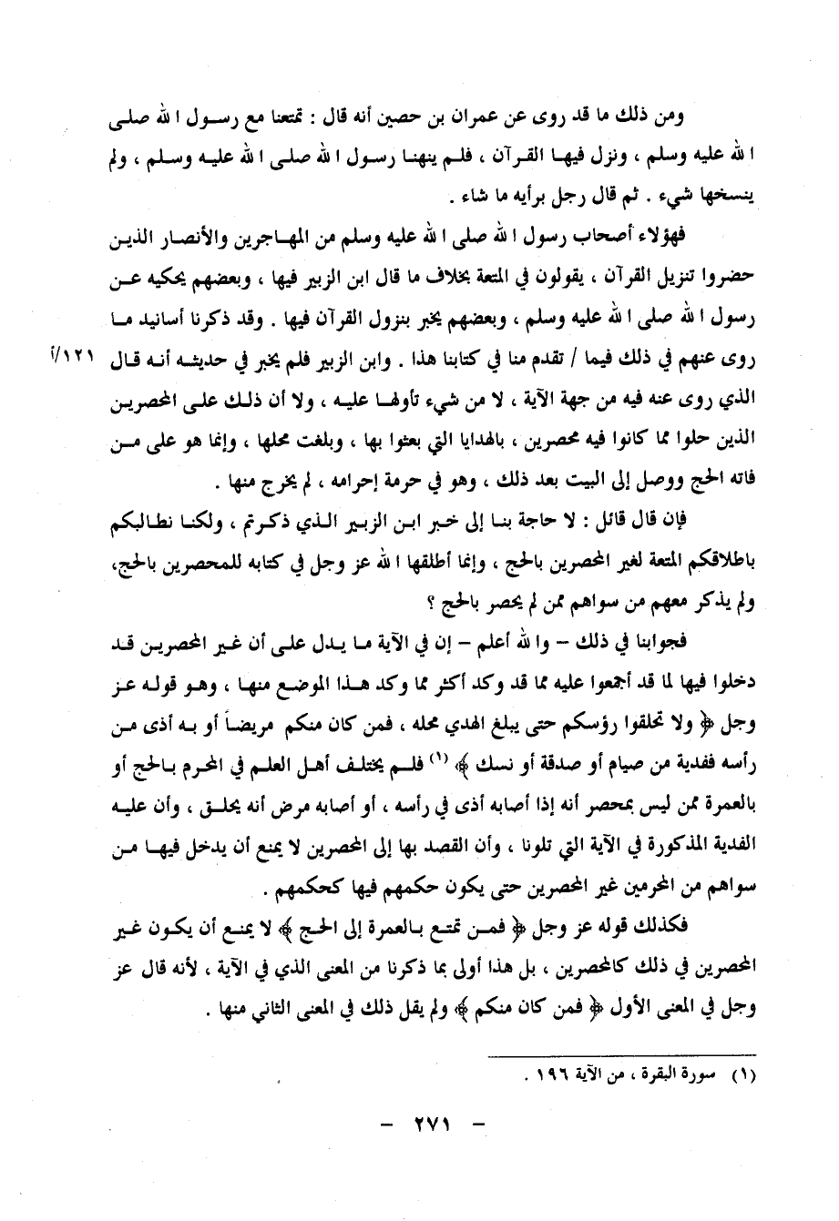 الَّذِي رُوِيَ عَنْهُ فِيهِ مِنْ جِهَةِ الْآيَةِ، لَا مِنْ شَيْءٍ تَأَوَّلَهَا عَلَيْهِ، وَلَا أَنَّ ذَلِكَ عَلَى الْمُحْصَرِينَ الَّذِينَ حَلُّوا مِمَّا كَانُوا فِيهِ مُحْصَرِينَ بِالْهَدَايَا الَّتِي بَعَثُوا بِهَا وَبَلَغَتْ مَحِلَّهَا، وَإِنَّمَا هُوَ عَلَى مَنْ فَاتَهُ الْحَجُّ، وَوَصَلَ إِلَى الْبَيْتِ بَعْدَ ذَلِكَ، وَهُوَ فِي حُرْمَةِ إِحْرَامِهِ، لَمْ يَخْرُجْ مِنْهَا فَإِنْ قَالَ قَائِلٌ: لَا حَاجَةَ بِنَا إِلَى خَبَرِ ابْنِ الزُّبَيْرِ الَّذِي ذَكَرْتُمْ، وَلَكِنْ نُطَالِبُكُمْ بِإِطْلَاقِكُمُ الْمُتْعَةَ لِغَيْرِ الْمُحْصَرِينَ بِالْحَجِّ، وَإِنَّمَا أَطْلَقَهَا اللهُ عَزَّ وَجَلَّ فِي كِتَابِهِ لِلْمُحْصَرِينَ بِالْحَجِّ، وَلَمْ يَذْكُرْ مَعَهُمْ مَنْ سِوَاهُمْ مِمَّنْ لَمْ يُحْصَرْ بِالْحَجِّ فَجَوَابُنَا فِي ذَلِكَ، وَاللهُ أَعْلَمُ، أَنَّ فِي الْآيَةِ مَا يَدُلُّ عَلَى أَنَّ غَيْرَ الْمُحْصَرِينَ قَدْ دَخَلُوا فِيهَا لِمَا قَدْ أَجْمَعُوا عَلَيْهِ مِمَّا قَدْ وُكِّدَ أَكْثَرَ مِمَّا وُكِّدَ هَذَا الْمَوْضِعُ مِنْهَا، وَهُوَ قَوْلُهُ عَزَّ وَجَلَّ: {وَلا تَحْلِقُوا رُءُوسَكُمْ حَتَّى يَبْلُغَ الْهَدْيُ مَحِلَّهُ فَمَنْ كَانَ مِنْكُمْ مَرِيضًا أَوْ بِهِ أَذًى مِنْ رَأْسِهِ فَفِدْيَةٌ مِنْ صِيَامٍ أَوْ صَدَقَةٍ أَوْ نُسُكٍ} ، فَلَمْ يَخْتَلِفْ أَهْلُ الْعِلْمِ فِي الْمُحْرِمِ بِالْحَجِّ أَوْ بِالْعُمْرَةِ مِمَّنْ لَيْسَ بِمُحْصَرٍ أَنَّهُ إِذَا أَصَابَهُ أَذًى فِي رَأْسِهِ، أَوْ أَصَابَهُ مَرَضٌ، أَنَّهُ يَحْلِقُ، وَأَنَّ عَلَيْهِ الْفِدْيَةَ الْمَذْكُورَةَ فِي الْآيَةِ الَّتِي تَلَوْنَا، وَأَنَّ الْقَصْدَ بِهَا إِلَى الْمُحْصَرِينَ لَا يَمْنَعُ أَنْ يَدْخُلَ فِيهَا مَنْ سِوَاهُمْ مِنَ الْمُحْرِمِينَ غَيْرِ الْمُحْصَرِينَ حَتَّى يَكُونَ حُكْمُهُمْ فِيهَا كَحُكْمِهِمْ فَكَذَلِكَ قَوْلُهُ عَزَّ وَجَلَّ: {فَمَنْ تَمَتَّعَ بِالْعُمْرَةِ إِلَى الْحَجِّ} ، لَا يَمْنَعُ أَنْ يَكُونَ غَيْرُ الْمُحْصَرِينَ فِي ذَلِكَ كَالْمُحْصَرِينَ، بَلْ هَذَا أَوْلَى بِمَا ذَكَرْنَا مِنَ الْمَعْنَى الَّذِي فِي الْآيَةِ،