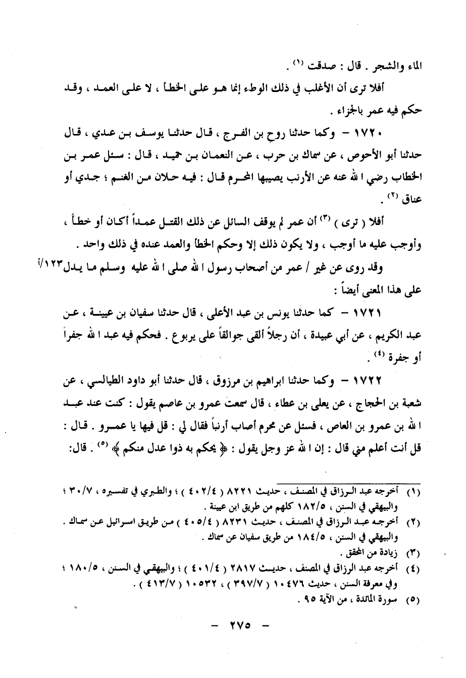 1720 - وَكَمَا حَدَّثَنَا رَوْحُ بْنُ الْفَرَجِ، قَالَ: حَدَّثَنَا يُوسُفُ بْنُ عَدِيٍّ، قَالَ: حَدَّثَنَا أَبُو الْأَحْوَصِ، عَنْ سِمَاكِ بْنِ حَرْبٍ، عَنِ النُّعْمَانِ بْنِ حُمَيْدٍ، قَالَ: " سُئِلَ عُمَرُ بْنُ الْخَطَّابِ رَضِيَ اللهُ عَنْهُ عَنِ الْأَرْنَبِ يُصِيبُهَا الْمُحْرِمُ، قَالَ: فِيهِ حِلَّانِ مِنَ الْغَنَمِ: جَدْيٌ أَوْ عَنَاقٌ " أَفَلَا تَرَى أَنَّ عُمَرَ لَمْ يُوقِفِ السَّائِلَ عَنِ ذَلِكَ الْقَتْلِ عَمْدًا أَكَانَ أَوْ خَطَأً، وَأَوْجَبَ عَلَيْهِ مَا أَوْجَبَ، وَلَا يَكُونُ ذَلِكَ إِلَّا وَحُكْمُ الْخَطَإِ وَالْعَمْدِ عِنْدَهُ فِي ذَلِكَ وَاحِدٌ وَقَدْ رُوِيَ عَنْ غَيْرِ عُمَرَ مِنْ أَصْحَابِ رَسُولِ اللهِ صَلَّى اللَّهُ عَلَيْهِ وَسَلَّمَ مَا يَدُلُّ عَلَى هَذَا الْمَعْنَى أَيْضًا