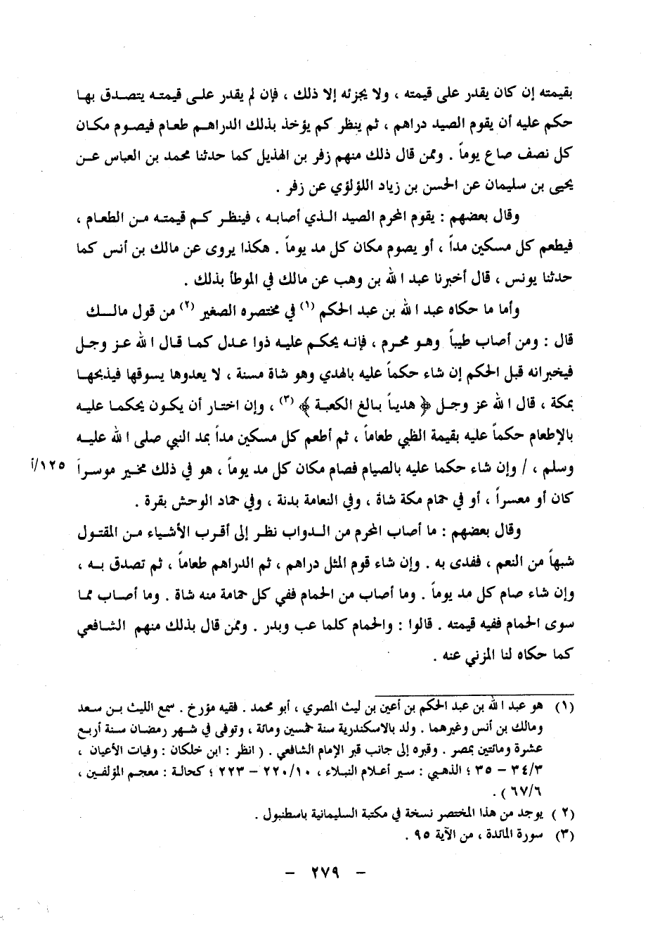 فَإِنْ لَمْ يَقْدِرْ عَلَى قِيمَتِهِ يَتَصَدَّقُ بِهَا حُكِمَ عَلَيْهِ أَنْ يُقَوِّمَ الصَّيْدَ دَرَاهِمَ، ثُمَّ يَنْظُرَ كَمْ يُؤْخَذُ بِتِلْكَ الدَّرَاهِمِ طَعَامٌ، فَيَصُومُ مَكَانَ كُلِّ نِصْفِ صَاعٍ يَوْمًا وَمِمَّنْ قَالَ ذَلِكَ مِنْهُمْ زُفَرُ بْنُ الْهُذَيْلِ كَمَا حَدَّثَنَا مُحَمَّدُ بْنُ الْعَبَّاسِ، عَنْ يَحْيَى بْنِ سُلَيْمَانَ، عَنِ الْحَسَنِ بْنِ زِيَادٍ اللُّؤْلُئِيِّ، عَنْ زُفَرَ وَقَالَ بَعْضُهُمْ: يُقَوِّمُ الْمُحْرِمُ الصَّيْدَ الَّذِي أَصَابَهُ، فَيَنْظُرُ كَمْ قِيمَتُهُ مِنَ الطَّعَامِ، فَيُطْعِمُ كُلَّ مِسْكِينٍ مُدًّا، أَوْ يَصُومُ مَكَانَ كُلِّ مُدٍّ يَوْمًا هَكَذَا يُرْوَى عَنْ مَالِكِ بْنِ أَنَسٍ كَمَا حَدَّثَنَا يُونُسُ، قَالَ: أَخْبَرَنَا عَبْدُ اللهِ بْنُ وَهْبٍ، عَنْ مَالِكٍ فِي الْمُوَطَّإِ بِذَلِكَ وَأَمَّا مَا حَكَاهُ عَبْدُ اللهِ بْنُ عَبْدِ الْحَكَمِ فِي مُخْتَصَرِهِ الصَّغِيرِ مِنْ قَوْلِ مَالِكٍ، قَالَ: وَمَنْ أَصَابَ طِيبًا وَهُوَ مُحْرِمٌ، فَإِنَّهُ يَحْكُمُ عَلَيْهِ ذَوَا عَدْلٍ كَمَا قَالَ اللهُ عَزَّ وَجَلَّ، فيخبرانه قبل الحكم إِن شَاءَ حكما عَلَيْهِ بِالْهَدْي وَهُوَ شَاة مُسِنَّة، لَا يَعْدُوهَا، يَسُوقُهَا فَيَذْبَحُهَا بِمَكَّةَ، قَالَ اللهُ عَزَّ وَجَلَّ: {هَدْيًا بَالِغَ الْكَعْبَةِ} ، وَإِنِ أَنْ يَكُونَ يَحْكُمَا عَلَيْهِ بِالْإِطْعَامِ حَكَمَا عَلَيْهِ بِقِيمَةِ الظَّبْيِ طَعَامًا، ثُمَّ أَطْعَمَ كُلَّ مِسْكِينٍ مُدًّا بِمُدِّ النَّبِيِّ صَلَّى اللَّهُ عَلَيْهِ وَسَلَّمَ، وَإِنْ شَاءَ حَكَمَا عَلَيْهِ بِالصِّيَامِ، فَصَامَ مَكَانَ كُلِّ مُدٍّ يَوْمًا، هُوَ فِي ذَلِكَ مُخَيَّرٌ، مُوسِرًا كَانَ أَوْ مَعْسِرًا، أَوْ فِي حَمَامِ مَكَّةَ شَاةٌ، وَفِي النَّعَامَةِ بَدَنَةٌ، وَفِي حِمَارِ الْوَحْشِ بَقَرَةٌ وَقَالَ بَعْضُهُمْ: مَا أَصَابَ الْمُحْرِمُ مِنَ الدَّوَابِّ نُظِرَ إِلَى أَقْرَبِ الْأَشْيَاءِ مِنَ الْمَقْتُولِ شَبَهًا مِنَ النَّعَمِ، فَفَدَى بِهِ، وَإِنْ