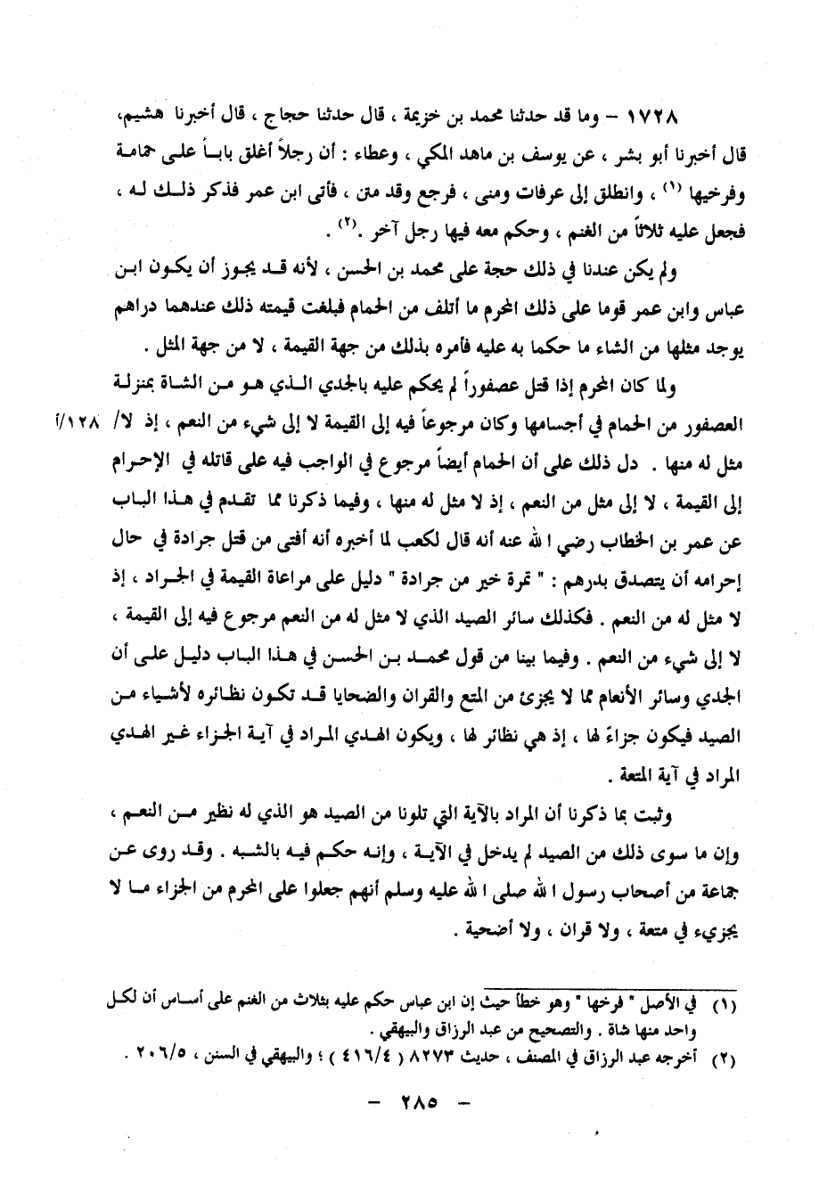 1728 - وَمَا قَدْ حَدَّثَنَا مُحَمَّدُ بْنُ خُزَيْمَةَ، قَالَ: حَدَّثَنَا حَجَّاجٌ، قَالَ: أَخْبَرَنَا هُشْيَمٌ، قَالَ: أَخْبَرَنَا أَبُو بِشْرٍ، عَنْ يُوسُفَ بْنِ مَاهِدٍ الْمَكِّيِّ، وَعَطَاءٍ، " أَنَّ رَجُلًا أَغْلَقَ بَابًا عَلَى حَمَامَةٍ وَفَرْخَيْهَا، وَانْطَلَقَ إِلَى عَرَفَاتٍ وَمِنًى، فَرَجَعَ وَقَدْ مِتْنَ، فَأَتَى ابْنَ عُمَرَ، فَذَكَرَ ذَلِكَ لَهُ، فَجَعَلَ عَلَيْهِ ثَلَاثًا مِنَ الْغَنَمِ، وَحَكَمَ مَعَهُ فِيهَا رَجُلٌ آخَرُ " وَلَمْ يَكُنْ عِنْدَنَا فِي ذَلِكَ حُجَّةٌ عَلَى مُحَمَّدِ بْنِ الْحَسَنِ، لِأَنَّهُ قَدْ يَجُوزُ أَنْ يَكُونَ ابْنُ عَبَّاسٍ وَابْنُ عُمَرَ قَوَّمَا عَلَى ذَلِكَ الْمُحْرِمِ مَا أَتْلَفَ مِنَ الْحَمَامِ، فَبَلَغَتْ قِيمَتُهُ ذَلِكَ عِنْدَهُمَا دَرَاهِمَ يُوجَدُ مِثْلُهَا مِنَ الشَّاءِ مَا حَكَمَا بِهِ عَلَيْهِ