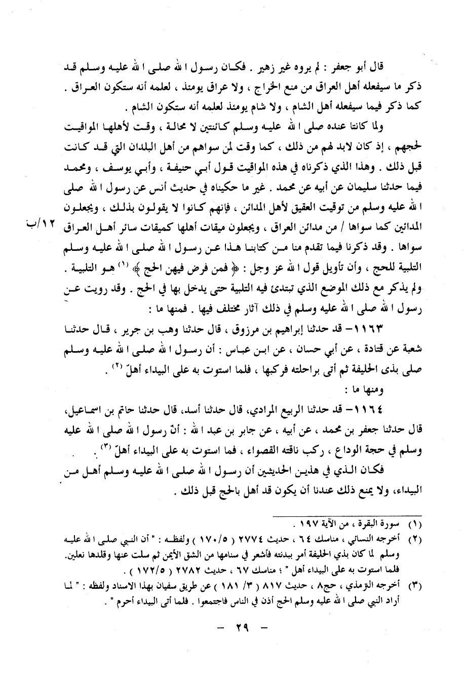 1164 - قَدْ حَدَّثَنَا الرَّبِيعُ الْمُرَادِيُّ، قَالَ: حَدَّثَنَا أَسَدٌ، قَالَ: حَدَّثَنَا حَاتِمُ بْنُ إِسْمَاعِيلَ، قَالَ: حَدَّثَنَا جَعْفَرُ بْنُ مُحَمَّدٍ، عَنْ أَبِيهِ، عَنْ جَابِرِ بْنِ عَبْدِ اللهِ: " أَنَّ رَسُولَ اللهِ صَلَّى اللَّهُ عَلَيْهِ وَسَلَّمَ فِي حَجَّةِ الْوَدَاعِ، رَكِبَ نَاقَتَهُ الْقَصْوَاءَ، فَلَمَّا اسْتَوَتْ بِهِ عَلَى الْبَيْدَاءِ أَهَلَّ " فَكَانَ الَّذِي فِي هَذَيْنِ الْحَدِيثَيْنِ أَنَّ رَسُولَ اللهِ صَلَّى اللَّهُ عَلَيْهِ وَسَلَّمَ أَهَلَّ مِنَ الْبَيْدَاءِ، وَلَا يَمْنَعُ ذَلِكَ عِنْدَنَا أَنْ يَكُونَ قَدْ أَهَلَّ بِالْحَجِّ قَبْلَ ذَلِكَ