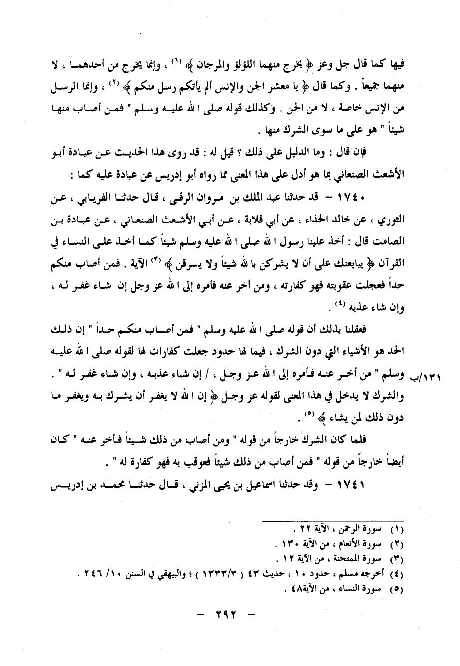 1740 - قَدْ حَدَّثَنَا عَبْدُ الْمَلِكِ بْنُ مَرْوَانَ الرَّقِّيُّ، قَالَ: حَدَّثَنَا الْفِرْيَابِيُّ، عَنِ الثَّوْرِيِّ، عَنْ خَالِدٍ الْحَذَّاءِ، عَنْ أَبِي قِلَابَةَ، عَنْ أَبِي الْأَشْعَثِ الصَّنْعَانِيِّ، عَنْ عُبَادَةَ بْنِ الصَّامِتِ، قَالَ: " أَخَذَ عَلَيْنَا رَسُولُ اللهِ صَلَّى اللَّهُ عَلَيْهِ وَسَلَّمَ شَيْئًا كَمَا أَخَذَ عَلَى النِّسَاءِ فِي الْقُرْآنِ: {يُبَايِعْنَكَ عَلَى أَنْ لَا يُشْرِكْنَ بِاللهِ شَيْئًا وَلا يَسْرِقْنَ} ، الْآيَةَ فَمَنْ أَصَابَ مِنْكُمْ حَدًّا فَعُجِّلَتْ عُقُوبَتُهُ فَهُوَ كَفَّارَتُهُ، وَمَنْ أُخِّرَ عَنْهُ فَأَمْرُهُ إِلَى اللهِ عَزَّ وَجَلَّ إِنْ شَاءَ غَفَرَ لَهُ، وَإِنْ شَاءَ عَذَّبَهُ " فَعَقَلْنَا بِذَلِكَ أَنَّ قَوْلَهُ صَلَّى اللَّهُ عَلَيْهِ وَسَلَّمَ: " فَمَنْ أَصَابَ مِنْكُمْ حَدًّا "، أَنَّ ذَلِكَ الْحَدَّ هُوَ الْأَشْيَاءُ الَّتِي دُونَ الشِّرْكِ، فِيمَا لَهَا حُدُودٌ جُعِلَتْ كَفَّارَاتٌ لَهَا لِقَوْلِهِ صَلَّى اللَّهُ عَلَيْهِ وَسَلَّمَ: " مَنْ أُخِّرَ عَنْهُ فَأَمْرُهُ إِلَى اللهِ عَزَّ وَجَلَّ، إِنْ شَاءَ عَذَّبَهُ، وَإِنْ شَاءَ غَفَرَ لَهُ " وَالشِّرْكُ لَا يَدْخُلُ فِي هَذَا الْمَعْنَى لِقَوْلِهِ عَزَّ وَجَلَّ: {إِنَّ اللهَ لَا يَغْفِرُ أَنْ يُشْرَكَ بِهِ وَيَغْفِرُ مَا دُونَ ذَلِكَ لِمَنْ يَشَاءُ} فَلَمَّا كَانَ الشِّرْكُ خَارِجًا مِنْ قَوْلِهِ: " وَمَنْ أَصَابَ مِنْ ذَلِكَ شَيْئًا فَأُخِّرَ عَنْهُ "، كَانَ أَيْضًا خَارِجًا مِنْ قَوْلِهِ: " فَمَنْ أَصَابَ مِنْ ذَلِكَ شَيْئًا فَعُوقِبَ بِهِ فَهُوَ كَفَّارَةٌ لَهُ "