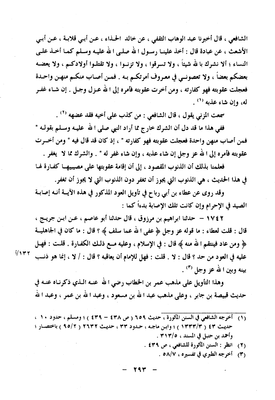 الشَّافِعِيُّ، قَالَ: أَخْبَرَنَا عَبْدُ الْوَهَّابِ الثَّقَفِيُّ، عَنْ خَالِدٍ الْحَذَّاءِ، عَنْ أَبِي قِلَابَةَ، عَنْ أَبِي الْأَشْعَثِ، عَنْ عُبَادَةَ، قَالَ: " أَخَذَ عَلَيْنَا رَسُولُ اللهِ صَلَّى اللَّهُ عَلَيْهِ وَسَلَّمَ كَمَا أَخَذَ عَلَى النِّسَاءِ، أَلَّا نُشْرِكَ بِاللهِ شَيْئًا، وَلَا تَسْرِقُوا، وَلَا تَزْنُوا، وَلَا تَقْتُلُوا أَوْلَادَكُمْ، وَلَا يَعْضَهُ بَعْضُكُمْ بَعْضًا، وَلَا تَعْصُونِي فِي مَعْرُوفٍ أَمَرْتُكُمْ بِهِ، فَمَنْ أَصَابَ مِنْكُمْ مِنْهُنَّ وَاحِدَةً، فَعُجِّلَتْ عُقُوبَتُهُ، فَهُوَ كَفَّارَةٌ، وَمَنْ أُخِّرَتْ عُقُوبَتُهُ، فَأَمْرُهُ إِلَى اللهِ عَزَّ وَجَلَّ، إِنْ شَاءَ غَفَرَ لَهُ، وَإِنْ شَاءَ عَذَّبَهُ " سَمِعْتُ الْمُزَنِيَّ يَقُولُ: قَالَ الشَّافِعِيُّ: مَنْ كَذَبَ عَلَى أَخِيهِ فَقَدْ عَضَهَهُ فَفِي هَذَا مَا قَدْ دَلَّ أَنَّ الشِّرْكَ خَارِجٌ مِمَّا أَرَادَ النَّبِيُّ صَلَّى اللَّهُ عَلَيْهِ وَسَلَّمَ بِقَوْلِهِ: " فَمَنْ أَصَابَ مِنْهُنَّ وَاحِدَةً، فَعُجِّلَتْ عُقُوبَتُهُ، فَهُوَ كَفَّارَتُهُ "، إِذْ كَانَ قَدْ قَالَ فِيهِ: " وَمَنْ أُخِّرَتْ عُقُوبَتُهُ، فَأَمْرُهُ إِلَى اللهِ عَزَّ وَجَلَّ، إِنْ شَاءَ عَذَّبَهُ، وَإِنْ شَاءَ غَفَرَ لَهُ "، وَالشِّرْكُ مِمَّا لَا يُغْفَرُ فَعَلِمْنَا بِذَلِكَ أَنَّ الذُّنُوبَ الْمَقْصُودَ إِلَى أَنَّ إِقَامَةَ عُقُوبَتِهَا عَلَى مُصِيبِيهَا كَفَّارَةٌ لَهَا فِي هَذَا الْحَدِيثِ، هِيَ الذُّنُوبُ الَّتِي يَجُوزُ أَنْ تُغْفَرَ دُونَ الذُّنُوبِ الَّتِي لَا يَجُوزُ أَنْ تُغْفَرَ وَقَدْ رُوِيَ عَنْ عَطَاءِ بْنِ أَبِي رَبَاحٍ فِي تَأْوِيلِ الْعَوْدِ الْمَذْكُورِ فِي هَذِهِ الْآيَةِ أَنَّهُ إِصَابَةُ الصَّيْدِ فِي الْإِحْرَامِ، وَإِنْ كَانَتْ تِلْكَ الْإِصَابَةُ بَدْءًا كَمَا