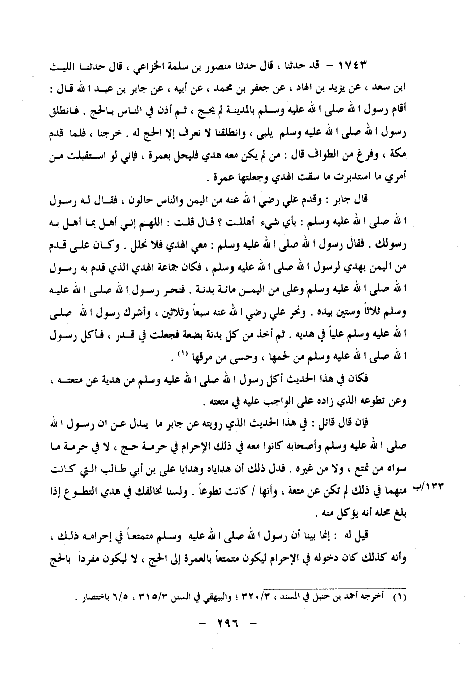 1743 - قَدْ حَدَّثَنَا، قَالَ: حَدَّثَنَا مَنْصُورُ بْنُ سَلَمَةَ الْخُزَاعِيُّ، قَالَ: حَدَّثَنَا اللَّيْثُ بْنُ سَعْدٍ، عَنْ يَزِيدَ بْنِ الْهَادِ، عَنْ جَعْفَرِ بْنِ مُحَمَّدٍ، عَنْ أَبِيهِ، عَنْ جَابِرِ بْنِ عَبْدِ اللهِ، قَالَ: أَقَامَ رَسُولُ اللهِ صَلَّى اللَّهُ عَلَيْهِ وَسَلَّمَ بِالْمَدِينَةِ لَمْ يَحُجَّ، ثُمَّ أَذَّنَ فِي النَّاسِ بِالْحَجِّ، فَانْطَلَقَ رَسُولُ اللهِ صَلَّى اللَّهُ عَلَيْهِ وَسَلَّمَ يُلَبِّي، وَانْطَلَقْنَا لَا نَعْرِفُ إِلَّا الْحَجَّ لَهُ، خَرَجْنَا، فَلَمَّا قَدِمَ مَكَّةَ، وَفَرَغَ مِنَ الطَّوَافِ، قَالَ: " مَنْ لَمْ يَكُنْ مَعَهُ هَدْيٌ فَلْيَحِلَّ بِعُمْرَةٍ، فَإِنِّي لَوِ اسْتَقْبَلْتُ مِنْ أَمْرِي مَا اسْتَدْبَرْتُ مَا سُقْتُ الْهَدْيَ، وَجَعَلْتُهَا عُمْرَةً " قَالَ جَابِرٌ: وَقَدِمَ عَلِيٌّ رَضِيَ اللهُ عَنْهُ مِنَ الْيَمَنِ وَالنَّاسُ حَالُّونَ، فَقَالَ لَهُ رَسُولُ اللهِ صَلَّى اللَّهُ عَلَيْهِ وَسَلَّمَ: " بِأَيِّ شَيْءٍ أَهْلَلْتَ؟ " قَالَ: قُلْتُ: اللهُمَّ إِنِّي أُهِلُّ بِمَا أَهَلَّ بِهِ رَسُولُكَ فَقَالَ رَسُولُ اللهِ صَلَّى اللَّهُ عَلَيْهِ وَسَلَّمَ: " مَعِيَ الْهَدْيُ فَلَا نُحْلِلْ " وَكَانَ عَلِيٌّ قَدِمَ مِنَ الْيَمَنِ بِهَدْيٍ لِرَسُولِ اللهِ صَلَّى اللَّهُ عَلَيْهِ وَسَلَّمَ، فَكَانَ جَمَاعَةُ الْهَدْيِ الَّذِي قَدِمَ بِهِ رَسُولُ اللهِ صَلَّى اللَّهُ عَلَيْهِ وَسَلَّمَ وَعَلِيٌّ مِنَ الْيَمَنِ مِائَةُ بَدَنَةٍ، فَنَحَرَ رَسُولُ اللهِ صَلَّى اللَّهُ عَلَيْهِ وَسَلَّمَ ثَلَاثًا وَسِتِّينَ بِيَدِهِ، وَنَحَرَ عَلِيٌّ رَضِيَ اللهُ عَنْهُ سَبْعًا وَثَلَاثِينَ، وَأَشْرَكَ رَسُولُ اللهِ صَلَّى اللَّهُ عَلَيْهِ وَسَلَّمَ عَلِيًّا فِي هَدْيِهِ، ثُمَّ أَخَذَ مِنْ كُلِّ بَدَنَةٍ بَضْعَةً، فَجُعِلَتْ فِي قِدْرٍ، فَأَكَلَ رَسُولُ اللهِ صَلَّى اللَّهُ عَلَيْهِ وَسَلَّمَ مِنْ لَحْمِهَا، وَحَسَا مِنْ مَرَقِهَا
