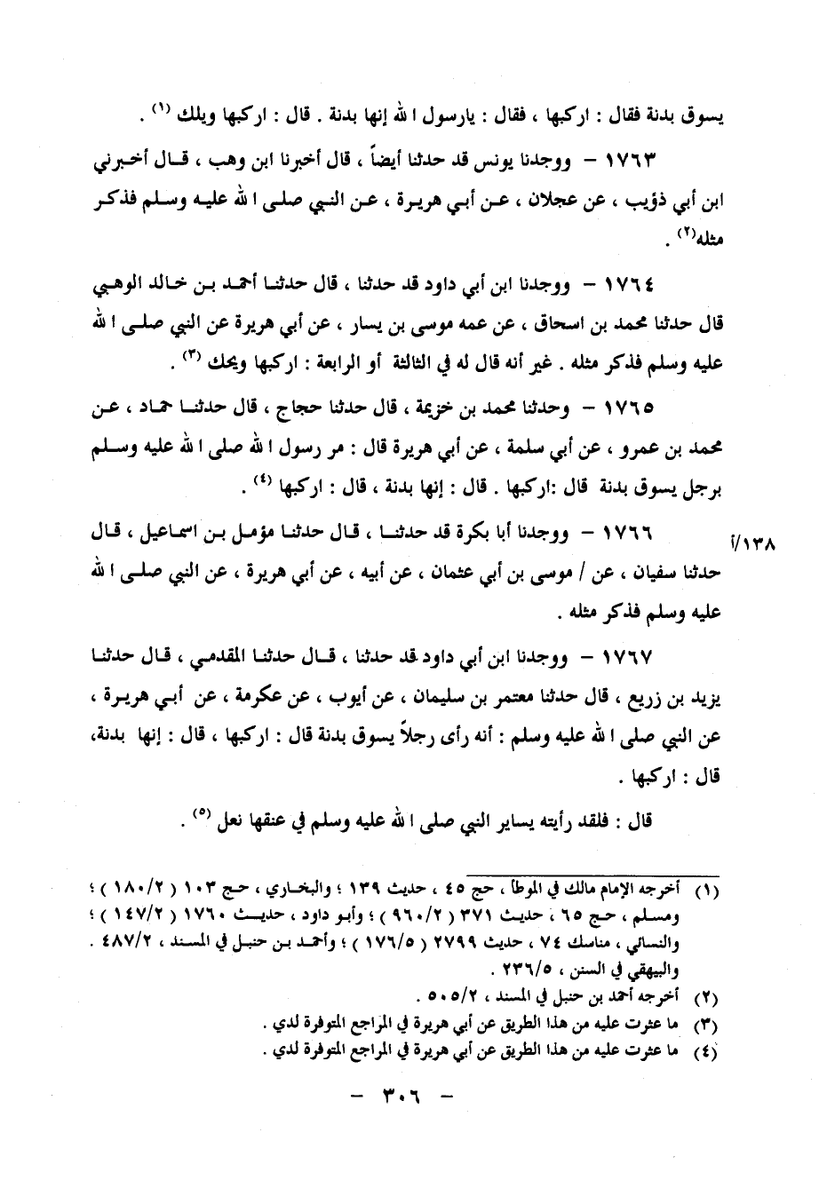 يَسُوقُ بَدَنَةً، فَقَالَ: ارْكَبْهَا فَقَالَ: يَا رَسُولَ اللهِ، إِنَّهَا بَدَنَةٌ قَالَ: ارْكَبْهَا وَيْلَكَ "،