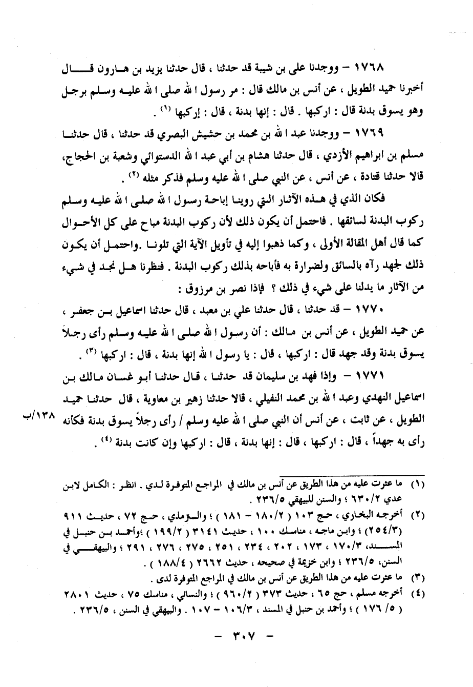 1768 - وَوَجْدَنَا عَلِيَّ بْنَ شَيْبَةَ، قَدْ حَدَّثَنَا، قَالَ: حَدَّثَنَا يَزِيدُ بْنُ هَارُونَ، قَالَ: أَخْبَرَنَا حُمَيْدٌ الطَّوِيلُ، عَنْ أَنَسِ بْنِ مَالِكٍ، قَالَ: " مَرَّ رَسُولُ اللهِ صَلَّى اللَّهُ عَلَيْهِ وَسَلَّمَ بِرَجُلٍ وَهُوَ يَسُوقُ بَدَنَةً، قَالَ: ارْكَبْهَا قَالَ: إِنَّهَا بَدَنَةٌ قَالَ: ارْكَبْهَا "،