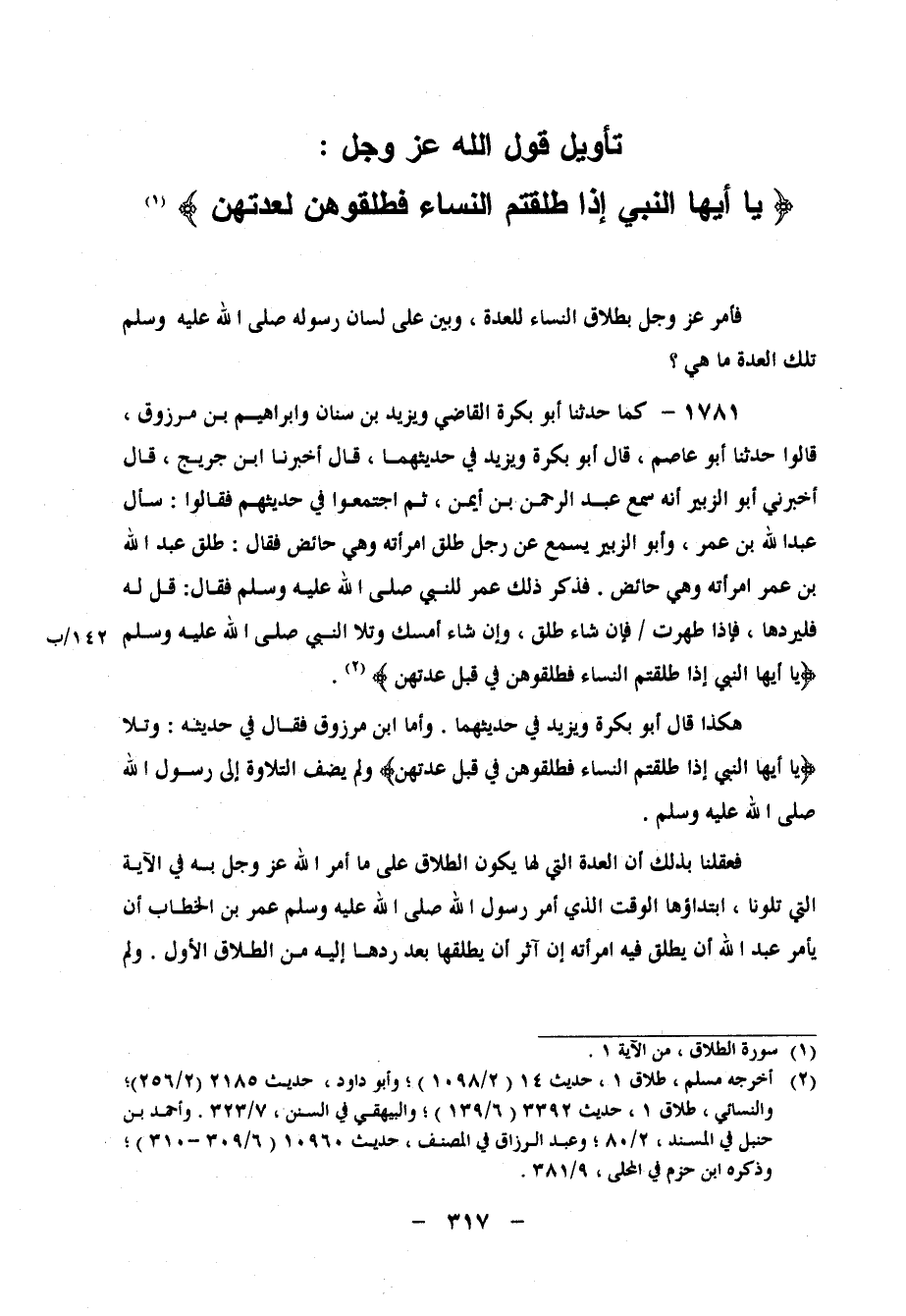 1781 - كَمَا حَدَّثَنَا أَبُو بَكْرَةَ الْقَاضِي، وَيَزِيدُ بْنُ سِنَانٍ، وَإِبْرَاهِيمُ بْنُ مَرْزُوقٍ، قَالُوا: حَدَّثَنَا أَبُو عَاصِمٍ، قَالَ أَبُو بَكْرَةَ، وَيَزِيدُ فِي حَدِيثِهِمَا قَالَ: أَخْبَرَنَا ابْنُ جُرَيْجٍ، قَالَ: أَخْبَرَنِي أَبُو الزُّبَيْرِ، أَنَّهُ سَمِعَ عَبْدَ الرَّحْمَنِ بْنَ أَيْمَنَ، ثُمَّ اجْتَمَعُوا فِي حَدِيثِهِمْ، فَقَالُوا: سَأَلَ عَبْدَ اللهِ بْنَ عُمَرَ، وَأَبُو الزُّبَيْرِ يَسْمَعُ، عَنْ رَجُلٍ طَلَّقَ امْرَأَتَهُ وَهِيَ حَائِضٌ، فَقَالَ: طَلَّقَ عَبْدُ اللهِ بْنُ عُمَرَ امْرَأَتَهُ وَهِيَ حَائِضٌ، فَذَكَرَ ذَلِكَ عُمَرُ لِلنَّبِيِّ صَلَّى اللَّهُ عَلَيْهِ وَسَلَّمَ، فَقَالَ: " قُلْ لَهُ فَلْيَرُدَّهَا، فَإِذَا طَهُرَتْ فَإِنْ شَاءَ طَلَّقَ، وَإِنْ شَاءَ أَمْسَكَ "، وَتَلا النَّبِيُّ صَلَّى اللَّهُ عَلَيْهِ وَسَلَّمَ: يَأَيُّهَا النَّبِيُّ إِذَا طَلَّقْتُمُ النِّسَاءَ فَطَلِّقُوهُنَّ فِي قَبْلِ عِدَّتِهِنَّ هَكَذَا قَالَ أَبُو بَكْرَةَ وَيَزِيدُ فِي حَدِيثِهِمَا وَأَمَّا ابْنُ مَرْزُوقٍ فَقَالَ فِي حَدِيثِهِ: وَتَلا: يَأَيُّهَا النَّبِيُّ إِذَا طَلَّقْتُمُ النِّسَاءَ فَطَلِّقُوهُنَّ لَفِي قَبْلِ عِدَّتِهِنَّ وَلَمْ يُضِفِ التِّلاوَةَ إِلَى رَسُولِ اللهِ صَلَّى اللَّهُ عَلَيْهِ وَسَلَّمَ فَعَقَلْنَا بِذَلِكَ أَنَّ الْعِدَّةَ الَّتِي لَهَا يَكُونُ الطَّلاقُ عَلَى مَا أَمَرَ اللهُ عَزَّ وَجَلَّ بِهِ فِي الآيَةِ الَّتِي تَلَوْنَا، ابْتِدَاؤُهَا الْوَقْتُ الَّذِي أَمَرَ رَسُولُ اللهِ صَلَّى اللَّهُ عَلَيْهِ وَسَلَّمَ عُمَرَ بْنَ الْخَطَّابِ أَنْ يَأْمُرَ عَبْدَ اللهِ أَنْ يُطَلِّقَ فِيهِ امْرَأَتَهُ إِنْ آثَرَ أَنْ يُطَلِّقَهَا بَعْدَ رَدِّهَا إِلَيْهِ مِنَ الطَّلاقِ الأَوَّلِ وَلَمْ