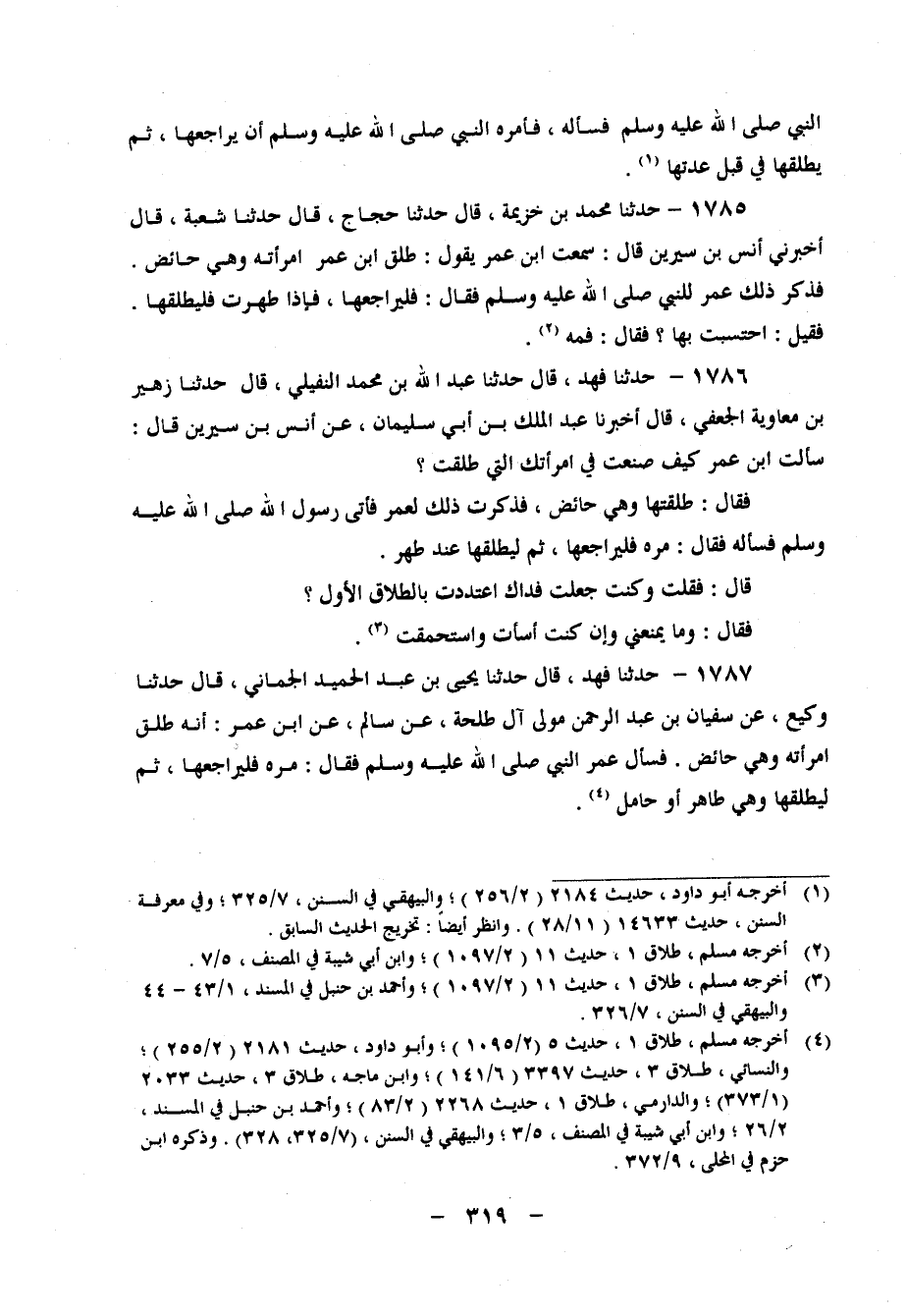 1787 - حَدَّثَنَا فَهْدٌ، قَالَ: حَدَّثَنَا يَحْيَى بْنُ عَبْدِ الْحَمِيدِ الْحِمَّانِيُّ، قَالَ: حَدَّثَنَا وَكِيعٌ، عَنْ سُفْيَانَ، عَنْ مُحَمَّدِ بْنِ عَبْدِ الرَّحْمَنِ مَوْلَى آلِ طَلْحَةَ، عَنْ سَالِمٍ، عَنِ ابْنِ عُمَرَ، أَنَّهُ طَلَّقَ امْرَأَتَهُ وَهِيَ حَائِضٌ، فَسَأَلَ عُمَرُ النَّبِيَّ صَلَّى اللَّهُ عَلَيْهِ وَسَلَّمَ فَقَالَ: " مُرْهُ فَلْيُرَاجِعْهَا، ثُمَّ لِيُطَلِّقْهَا وَهِيَ طَاهِرٌ أَوْ حَامِلٌ "