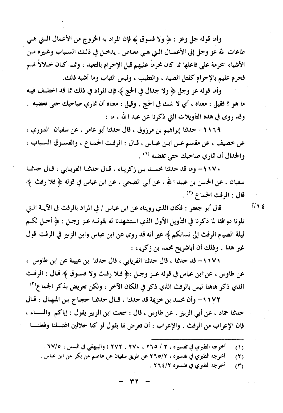 1170 - وَمَا قَدْ حَدَّثَنَا مُحَمَّدُ بْنُ زَكَرِيَّاءَ، قَالَ: حَدَّثَنَا الْفِرْيَابِيُّ، قَالَ: حَدَّثَنَا سُفْيَانُ، عَنِ الْحَسَنِ بْنِ عُبَيْدِ اللهِ، عَنْ أَبِي الضُّحَى، عَنِ ابْنِ عَبَّاسٍ، فِي قَوْلِهِ: " {فَلا رَفَثَ} ، قَالَ: الرَّفَثُ الْجِمَاعُ " قَالَ أَبُو جَعْفَرٍ: فَكَانَ الَّذِي رُوِّينَاهُ عَنِ ابْنِ عَبَّاسٍ فِي الْمُرَادِ بِالرَّفَثِ فِي الْآيَةِ الَّتِي تَلَوْنَا مُوَافِقًا لِمَا ذَكَرْنَا فِي التَّأْوِيلِ الْأَوَّلِ الَّذِي اسْتَشْهَدْنَا لَهُ بِقَوْلِهِ عَزَّ وَجَلَّ: {أُحِلَّ لَكُمْ لَيْلَةَ الصِّيَامِ الرَّفَثُ إِلَى نِسَائِكُمْ} غَيْرَ أَنَّهُ قَدْ رُوِيَ عَنِ ابْنِ عَبَّاسٍ وَابْنِ الزُّبَيْرِ فِي الرَّفَثِ قَوْلٌ غَيْرُ هَذَا