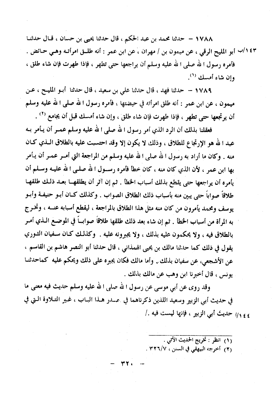 1789 - حَدَّثَنَا فَهْدٌ، قَالَ: حَدَّثَنَا عَلِيُّ بْنُ سَعِيدٍ، قَالَ: حَدَّثَنَا أَبُو الْمَلِيحِ، عَنْ مَيْمُونٍ، عَنِ ابْنِ عُمَرَ، " أَنَّهُ طَلَّقَ امْرَأَتَهُ فِي حَيْضَتِهَا، فَأَمَرَهُ رَسُولُ اللهِ صَلَّى اللَّهُ عَلَيْهِ وَسَلَّمَ أَنْ يَرْتَجِعَهَا حَتَّى تَطْهُرَ، فَإِذَا طَهُرَتْ فَإِنْ شَاءَ طَلَّقَ، وَإِنْ شَاءَ أَمْسَكَ قَبْلَ أَنْ يُجَامِعَ " فَعَقَلْنَا بِذَلِكَ أَنَّ الرَّدَّ الَّذِي أَمَرَ رَسُولُ اللهِ صَلَّى اللَّهُ عَلَيْهِ وَسَلَّمَ عُمَرَ أَنْ يَأْمُرَ بِهِ عَبْدَ اللهِ هُوَ الارْتِجَاعُ لِلطَّلاقِ، وَذَلِكَ لَا يَكُونُ إِلا وَقَدِ احْتُسِبَتْ عَلَيْهِ بِالطَّلاقِ الَّذِي كَانَ مِنْهُ وَكَانَ مَا أَرَادَ بِهِ رَسُولُ اللهِ صَلَّى الله عَلَيْهِ وَسَّلَمَ مِنَ الْمُرَاجَعَةِ الَّتِي أَمَرَ عُمَرَ أَنْ يَأْمُرَ بِهَا ابْنَ عُمَرَ، لأَنَّ الَّذِي كَانَ مِنْهُ كَانَ خَطَأً، فَأَمَرَهُ رَسُولُ اللهِ صَلَّى الله عَلَيْهِ وَسَّلَمَ أَنْ يَأْمُرَهُ أَنْ يُرَاجِعَهَا حَتَّى يَقْطَعَ بِذَلِكَ أَسْبَابَ الْخَطَإِ ثُمَّ إِنْ آثَرَ أَنْ يُطَلِّقَهَا بَعْدَ ذَلِكَ طَلَّقَهَا طَلاقًا صَوَابًا حَتَّى يَبِينَ مِنْهُ بِأَسْبَابِ ذَلِكَ الطَّلاقِ الصَّوَابِ وَكَذَلِكَ كَانَ أَبُو حَنِيفَةَ، وَأَبُو يُوسُفَ، وَمُحَمَّدٌ يَأْمُرُونَ مَنْ كَانَ مِنْهُ مِثْلُ هَذَا الطَّلاقِ بِالْمُرَاجَعَةِ، لِيَقْطَعَ أَسْبَابَهُ عَنْهُ، وَتَخْرُجَ بِهِ الْمَرْأَةُ مِنْ أَسْبَابِ الْخَطَإِ، ثُمَّ إِنْ شَاءَ بَعْدَ ذَلِكَ طَلَّقَهَا طَلاقًا صَوَابًا فِي الْمَوْضِعِ الَّذِي أُمِرَ بِالطَّلاقِ فِيهِ، وَلا يَحْكُمُونَ عَلَيْهِ بِذَلِكَ، وَلا يُجْبِرُونَهُ عَلَيْهِ وَكَذَلِكَ كَانَ سُفْيَانُ الثَّوْرِيُّ يَقُولُ فِي ذَلِكَ كَمَا حَدَّثَنَا مَالِكُ بْنُ يَحْيَى الْهَمْذَانِيُّ، قَالَ: حَدَّثَنَا أَبُو النَّضْرِ هَاشِمُ بْنُ الْقَاسِمِ، عَنِ الأَشْجَعِيِّ، عَنْ سُفْيَانَ بِذَلِكَ وَأَمَّا مَالِكٌ فَكَانَ يُجْبِرُهُ عَلَى ذَلِكَ، وَيَحْكُمُ عَلَيْهِ كَمَا حَدَّثَنَا يُونُسُ، قَالَ: أَخْبَرَنَا ابْنُ وَهْبٍ، عَنْ
