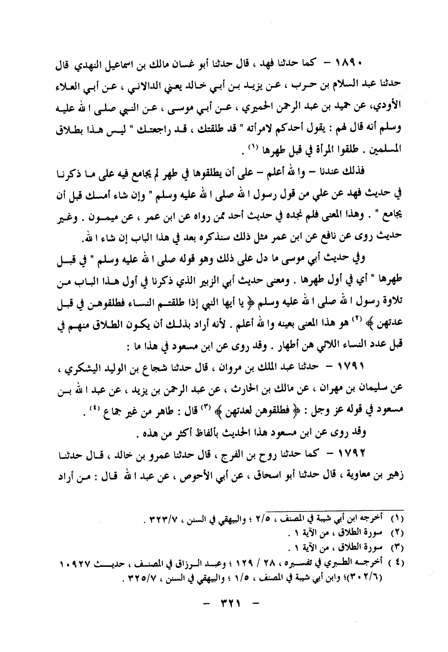 1791 - حَدَّثَنَا عَبْدُ الْمَلِكِ بْنُ مَرْوَانَ، قَالَ: حَدَّثَنَا شُجَاعُ بْنُ الْوَلِيدِ الْيَشْكُرِيُّ، عَنْ سُلَيْمَانَ بْنِ مِهْرَانَ، عَنْ مَالِكِ بْنِ الْحَارِثِ، عَنْ عَبْدِ الرَّحْمَنِ بْنِ يَزِيدَ، عَنْ عَبْدِ اللهِ بْنِ مَسْعُودٍ، فِي قَوْلِهِ عَزَّ وَجَلَّ: " {فَطَلِّقُوهُنَّ لِعِدَّتِهِنَّ} ، قَالَ: طَاهِرٌ مِنْ غَيْرِ جِمَاعٍ " وَقَدْ رُوِيَ عَنِ ابْنِ مَسْعُودٍ هَذَا الْحَدِيثُ بِأَلْفَاظٍ أَكْثَرَ مِنْ هَذِهِ