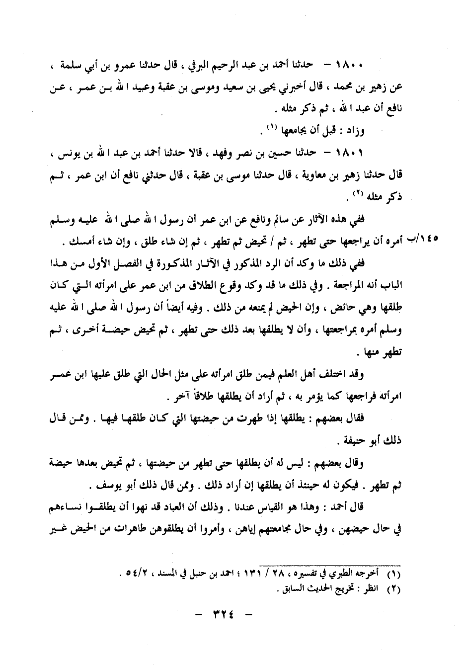 1801 - حَدَّثَنَا حُسَيْنُ بْنُ نَصْرٍ، وَفَهْدٌ، قَالا: حَدَّثَنَا أَحْمَدُ بْنُ عَبْدِ اللهِ بْنِ يُونُسَ، قَالَ: حَدَّثَنَا زُهَيْرُ بْنُ مُعَاوِيَةَ، قَالَ: حَدَّثَنَا مُوسَى بْنُ عُقْبَةَ، قَالَ: حَدَّثَنِي نَافِعٌ، أَنَّ ابْنَ عُمَرَ، ثُمَّ ذَكَرَ مِثْلَهُ فَفِي هَذِهِ الآثَارِ عَنْ سَالِمٍ، وَنَافِعٍ، عَنِ ابْنِ عُمَرَ، أَنَّ رَسُولَ اللهِ صَلَّى اللَّهُ عَلَيْهِ وَسَلَّمَ أَمَرَهُ أَنْ يُرَاجِعَهَا حَتَّى تَطْهُرَ، ثُمَّ تَحِيضَ، ثُمَّ تَطْهُرَ، ثُمَّ إِنْ شَاءَ طَلَّقَ، وَإِنْ شَاءَ أَمْسَكَ فَفِي