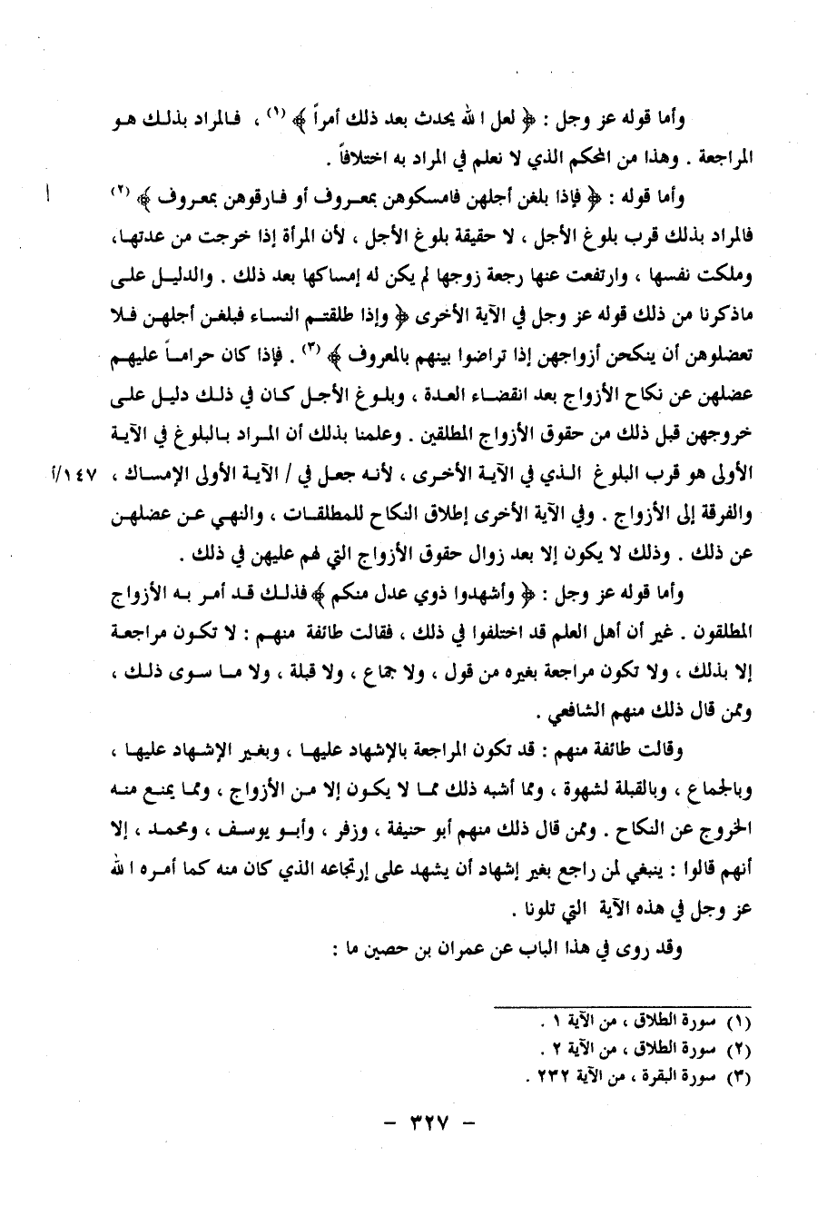 ذَلِكَ دَلِيلٌ عَلَى خُرُوجِهِنَّ قَبْلَ ذَلِكَ مِنْ حُقُوقِ الأَزْوَاجِ الْمُطَلِّقِينَ وَعَلِمْنَا بِذَلِكَ أَنَّ الْمُرَادَ بِالْبُلُوغِ فِي الآيَةِ الأُولَى هُوَ قُرْبُ الْبُلُوغِ الَّذِي فِي الآيَةِ الأُخْرَى، لأَنَّهُ جَعَلَ فِي الآيَةِ الأُولَى الإِمْسَاكَ، وَالْفُرْقَةَ إِلَى الأَزْوَاجِ، وَفِي الآيَةِ الأُخْرَى إِطْلاقُ النِّكَاحِ لِلْمُطَلَّقَاتِ، وَالنَّهْيُ عَنْ عَضْلِهِنَّ عَنْ ذَلِكَ وَذَلِكَ لَا يَكُونُ إِلا بَعْدَ زَوَالِ حُقُوقِ الأَزْوَاجِ الَّتِي لَهُمْ عَلَيْهِنَّ فِي ذَلِكَ وَأَمَّا قَوْلُهُ عَزَّ وَجَلَّ: {وَأَشْهِدُوا ذَوَيْ عَدْلٍ مِنْكُمْ} ، فَذَلِكَ قَدْ أُمِرَ بِهِ الأَزْوَاجُ الْمُطَلِّقُونَ، غَيْرَ أَنَّ أَهْلَ الْعِلْمِ قَدِ اخْتَلَفُوا فِي ذَلِكَ، فَقَالَتْ طَائِفَةٌ مِنْهُمْ: لَا تَكُونُ مُرَاجَعَةٌ إِلا بِذَلِكَ، وَلا تَكُونُ مُرَاجَعَةٌ بِغَيْرِهِ مِنْ قَوْلٍ، وَلا جِمَاعٍ، وَلا قُبْلَةٍ، وَلا مَا سِوَى ذَلِكَ وَمِمَّنْ قَالَ ذَلِكَ مِنْهُمُ الشَّافِعِيُّ وَقَالَتْ طَائِفَةٌ مِنْهُمْ: قَدْ تَكُونُ الْمُرَاجَعَةُ بِالإِشْهَادِ عَلَيْهَا، وَبِغَيْرِ الإِشْهَادِ عَلَيْهَا، وَبِالْجِمَاعِ، وَبِالْقُبْلَةِ لِشَهْوَةٍ، وَمِمَّا أَشْبَهَ ذَلِكَ مِمَّا لَا يَكُونُ إِلا مِنَ الأَزْوَاجِ، وَمِمَّا يَمْنَعُ مِنْهُ الْخُرُوجُ عَنِ النِّكَاحِ وَمِمَّنْ قَالَ ذَلِكَ مِنْهُمْ أَبُو حَنِيفَةَ، وَزُفَرُ، وَأَبُو يُوسُفَ، وَمُحَمَّدٌ، إِلا أَنَّهُمْ قَالُوا: يَنْبَغِي لِمَنْ رَاجَعَ بِغَيْرِ إِشْهَادٍ أَنْ يُشْهِدَ عَلَى ارْتِجَاعِهِ الَّذِي كَانَ مِنْهُ كَمَا أَمَرَهُ اللهُ عَزَّ وَجَلَّ فِي هَذِهِ الآيَةِ الَّتِي تَلَوْنَا وَقَدْ رُوِيَ فِي هَذَا الْبَابِ عَنْ عِمْرَانَ بْنِ حُصَيْنٍ مَا