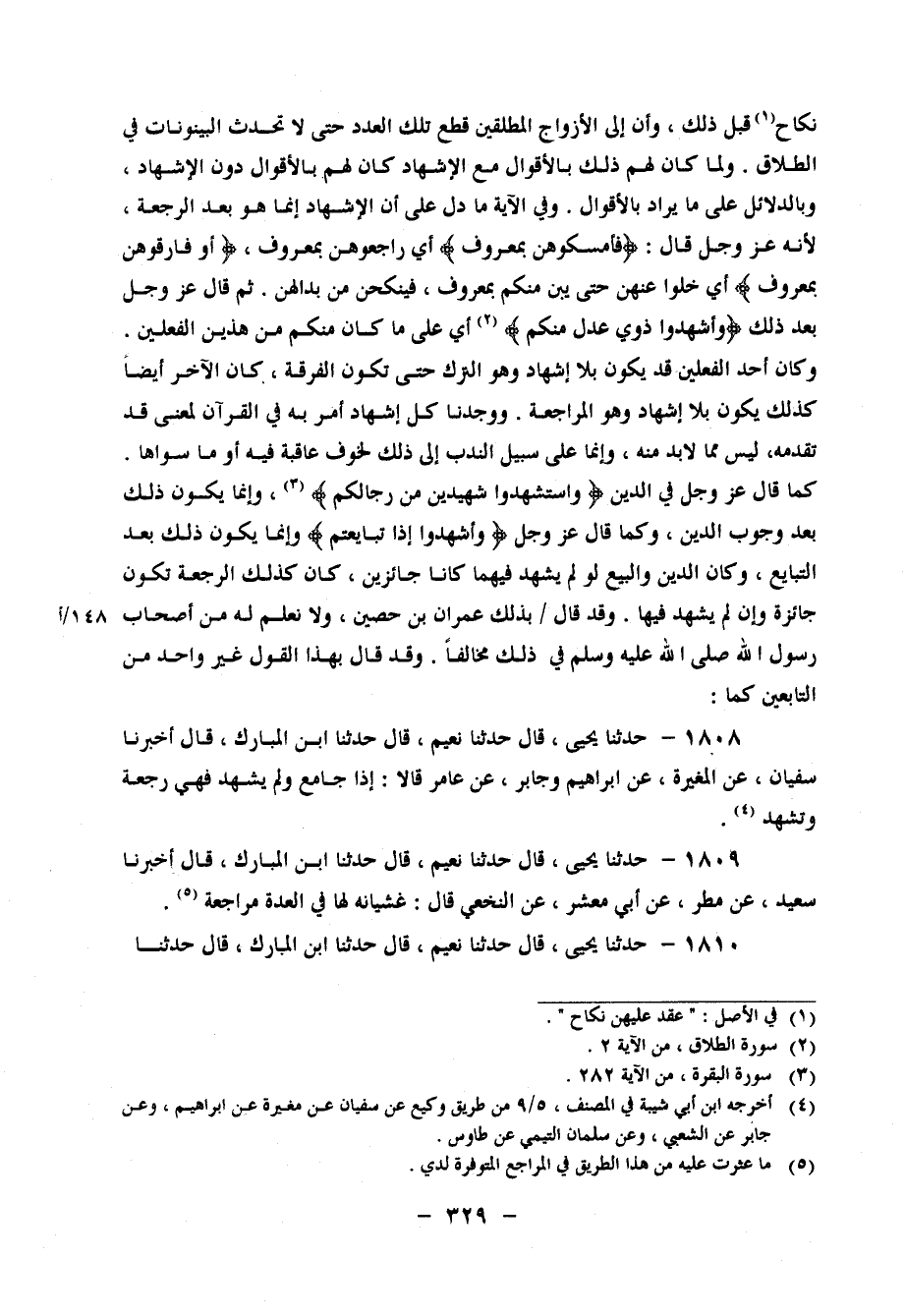 آيَة، وَإِنَّمَا يَكُونُ ذَلِكَ بَعْدَ وُجُوبِ الدَّيْنِ، وَكَمَا قَالَ عَزَّ وَجَلَّ: وَأَشْهِدُوا إِذَا تَبَايَعْتُمْ سُورَة الْبَقَرَة آيَة، وَإِنَّمَا يَكُونُ ذَلِكَ بَعْدَ التَّبَايُعِ، وَكَانَ الدَّيْنُ وَالْبَيْعُ لَوْ لَمْ يُشْهَدْ فِيهِمَا كَانَا جَائِزَيْنِ، كَانَ كَذَلِكَ الرَّجْعَةُ تَكُونُ جَائِزَةً وَإِنْ لَمْ يُشْهَدْ فِيهَا، وَقَدْ قَالَ بِذَلِكَ عِمْرَانُ بْنُ حُصَيْنٍ، وَلا نَعْلَمُ لَهُ مِنْ أَصْحَابِ رَسُولِ اللهِ صَلَّى اللَّهُ عَلَيْهِ وَسَلَّمَ فِي ذَلِكَ مُخَالِفًا وَقَدْ قَالَ بِهَذَا الْقَوْلِ غَيْرُ وَاحِدٍ مِنَ التَّابِعِينَ كَمَا