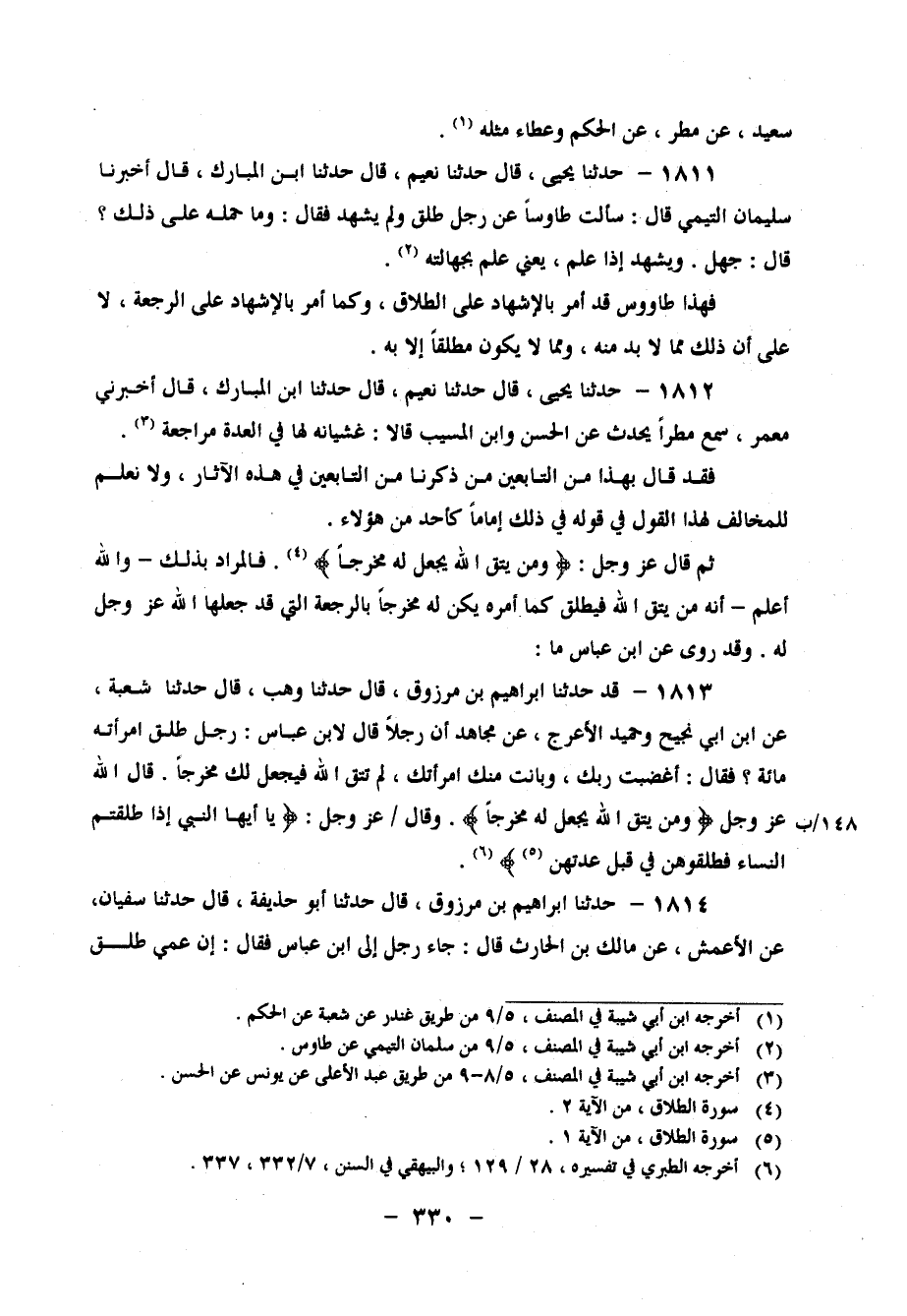 1811 - حَدَّثَنَا يَحْيَى، قَالَ: حَدَّثَنَا نُعَيْمٌ، قَالَ: حَدَّثَنَا ابْنُ الْمُبَارَكِ، قَالَ: أَخْبَرَنَا سُلَيْمَانُ التَّيْمِيُّ، قَالَ: سَأَلْتُ طَاوُسًا عَنْ رَجُلٍ طَلَّقَ وَلَمْ يُشْهِدْ، فَقَالَ: وَمَا حَمَلَهُ عَلَى ذَلِكَ؟ قَالَ: جَهِلَ، وَيُشْهِدُ إِذَا عَلِمَ " يَعْنِي عَلِمَ بِجَهَالَتِهِ فَهَذَا طَاوُسٌ قَدْ أَمَرَ بِالإِشْهَادِ عَلَى الطَّلاقِ، وَكَمَا أَمَرَ بِالإِشْهَادِ عَلَى الرَّجْعَةِ، لَا عَلَى أَنَّ ذَلِكَ مِمَّا لَا بُدَّ مِنْهُ، وَمِمَّا لَا يَكُونُ مُطَلِّقًا إِلا بِهِ