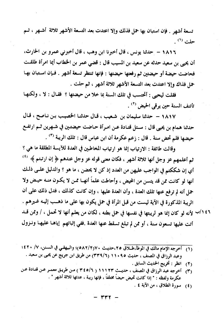 1816 - حَدَّثَنَا يُونُسُ، قَالَ: أَخْبَرَنَا ابْنُ وَهْبٍ، قَالَ: أَخْبَرَنِي عَمْرُو بْنُ الْحَارِثِ، أَنَّ يَحْيَى بْنَ سَعِيدٍ، حَدَّثَهُ عَنْ سَعِيدِ بْنِ الْمُسَيِّبِ، قَالَ: قَضَى عُمَرُ بْنُ الْخَطَّابِ " أَيُّمَا امْرَأَةٍ طُلِّقَتْ فَحَاضَتْ حَيْضَةً أَوْ حَيْضَتَيْنِ، ثُمَّ رَفَعَتْهَا حَيْضَتُهَا، فَإِنَّهَا تَنْتَظِرُ تِسْعَةَ أَشْهُرٍ، فَإِنِ اسْتَبَانَ بِهَا حَمْلٌ فَذَلِكَ وَإِلا اعْتَدَّتْ بَعْدَ التِّسْعَةِ الأَشْهُرِ ثَلاثَةَ أَشْهُرٍ، ثُمَّ حَلَّتْ " فَقُلْتُ لِيَحْيَى: أَتَحْتَسِبُ فِي تِلْكَ السَّنَةِ بِمَا خَلا مِنْ حَيْضَتِهَا؟ فَقَالَ: لَا، وَلَكِنَّهَا تَأْتَنِفُ السَّنَةَ حِينَ يَرْقَى الْحَيْضُ