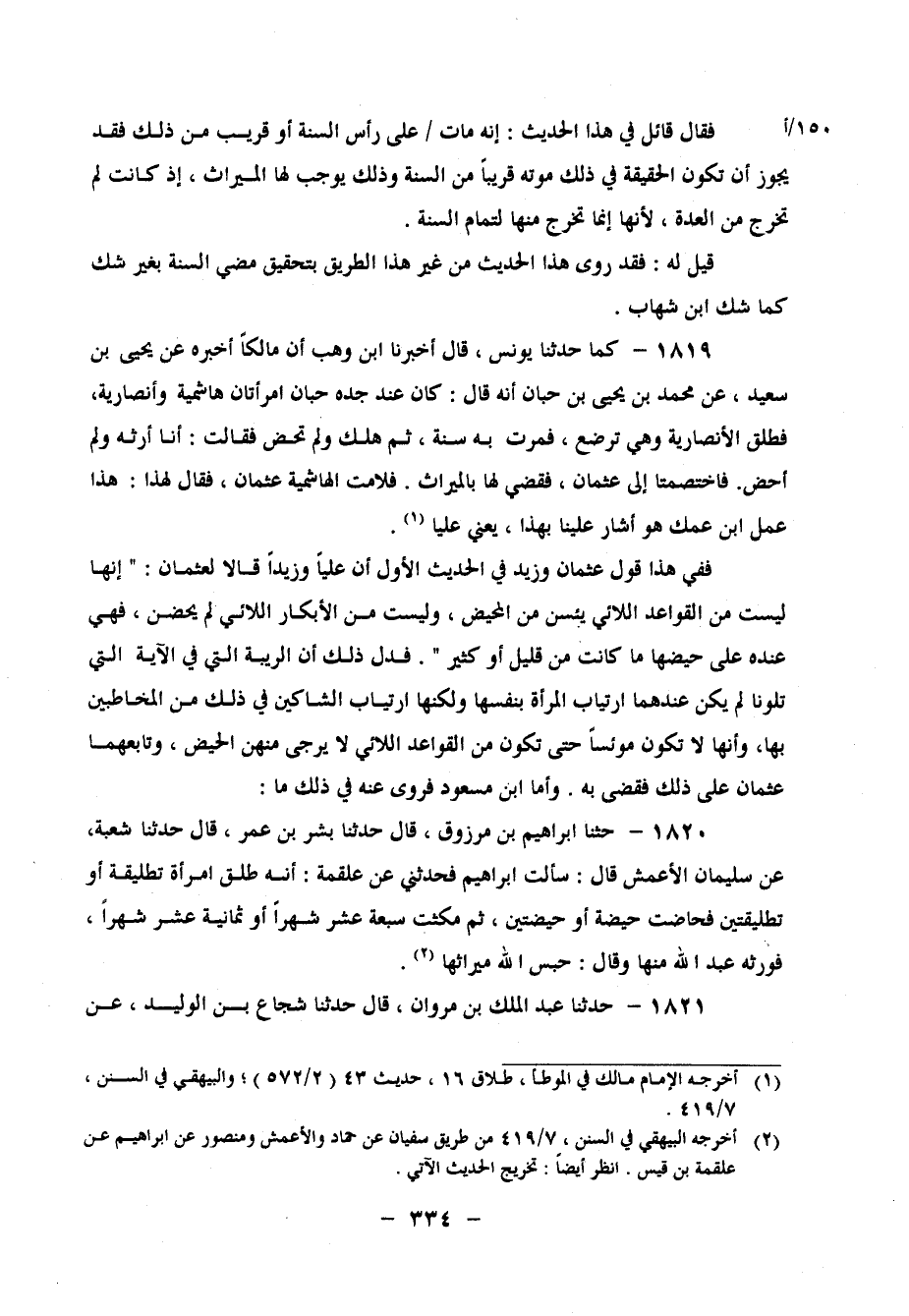 1819 - كَمَا حَدَّثَنَا يُونُسُ، قَالَ: أَخْبَرَنَا ابْنُ وَهْبٍ، أَنَّ مَالِكًا، أَخْبَرَهُ، عَنْ يَحْيَى بْنِ سَعِيدٍ، عَنْ مُحَمَّدِ بْنِ يَحْيَى بْنِ حَبَّانَ، أَنَّهُ قَالَ: " كَانَ عِنْدَ جَدِّهِ حَبَّانَ امْرَأَتَانِ: هَاشِمِيَّةٌ، وَأَنْصَارِيَّةٌ، فَطَلَّقَ الأَنْصَارِيَّةَ وَهِيَ تُرْضِعُ، فَمَرَّتْ بِهِ سَنَةٌ، ثُمَّ هَلَكَ وَلَمْ تَحِضْ، فَقَالَتْ: أَنَا أَرِثُهُ وَلَمْ أَحِضْ فَاخْتَصَمَتَا إِلَى عُثْمَانَ، فَقَضَى لَهَا بِالْمِيرَاثِ، فَلامَتِ الْهَاشِمِيَّةُ عُثْمَانَ، فَقَالَ لَهَا: هَذَا عَمَلُ ابْنِ عَمِّكِ، هُوَ أَشَارَ عَلَيْنَا بِهَذَا "، يَعْنِي عَلِيًّا فَفِي هَذَا قَوْلُ عُثْمَانَ وَزَيْدٍ فِي الْحَدِيثِ الأَوَّلِ، أَنَّ عَلِيًّا وَزَيْدًا قَالا لِعُثْمَانَ: " إِنَّهَا لَيْسَتْ مِنَ الْقَوَاعِدِ اللائِي يَئِسْنَ مِنَ الْمَحِيضِ، وَلَيْسَتْ مِنَ الأَبْكَارِ اللائِي لَمْ يَحِضْنَ، فَهِيَ عِنْدَهُ عَلَى حَيْضِهَا مَا كَانَتْ مِنْ قَلِيلٍ أَوْ كَثِيرٍ " فَدَلَّ ذَلِكَ أَنَّ الرِّيبَةَ الَّتِي فِي الآيَةِ الَّتِي تَلَوْنَا لَمْ تَكُنْ عِنْدَهُمَا ارْتِيَابُ الْمَرْأَةِ بِنَفْسِهَا، وَلَكِنَّهَا ارْتِيَابُ الشَّاكِّينَ فِي ذَلِكَ مِنَ الْمُخَاطَبِينَ بِهَا، وَأَنَّهَا لَا تَكُونُ مُوئِسًا حَتَّى تَكُونَ مِنَ الْقَوَاعِدِ اللائِي لَا يُرْجَى مِنْهُنَّ الْحَيْضُ، وَتَابَعَهُمَا عُثْمَانُ عَلَى ذَلِكَ فَقَضَى بِهِ وَأَمَّا ابْنُ مَسْعُودٍ فَرُوِيَ عَنْهُ فِي ذَلِكَ مَا