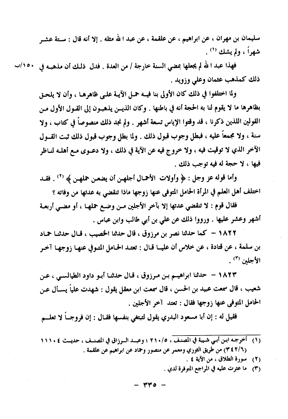 سُلَيْمَانَ بْنِ مِهْرَانَ، عَنْ إِبْرَاهِيمَ، عَنْ عَلْقَمَةَ، عَنْ عَبْدِ اللهِ، مِثْلَهُ إِلا أَنَّهُ قَالَ: سِتَّةَ عَشَرَ شَهْرًا، وَلَمْ يَشُكَّ فَهَذَا عَبْدُ اللهِ لَمْ يَجْعَلْهَا بِمُضِيِّ السَّنَةِ خَارِجَةً مِنَ الْعِدَّةِ، فَدَلَّ ذَلِكَ أَنَّ مَذْهَبَهُ فِي ذَلِكَ كَمَذْهَبِ عُثْمَانَ، وَعَلِيٍّ، وَزَيْدٍ وَلَمَّا اخْتَلَفُوا فِي ذَلِكَ كَانَ الأَوْلَى بِنَا فِيهِ حَمْلُ الآيَةِ عَلَى ظَاهِرِهَا، وَأَلا يُلْحَقَ بِظَاهِرِهَا مَا لَا يَقُومُ لَنَا بِهِ الْحُجَّةُ أَنَّهُ فِي بَاطِنِهَا وَكَانَ الَّذِينَ يَذْهَبُونَ إِلَى الْقَوْلِ الأَوَّلِ مِنَ الْقَوْلَيْنِ اللَّذَيْنِ ذَكَرْنَا، قَدْ وَقَّتُوا الإِياسَ تِسْعَةَ أَشْهُرٍ، وَلَمْ نَجِدْ ذَلِكَ مَنْصُوصًا فِي كِتَابٍ، وَلا سُنَّةٍ، وَلا مُجْمَعًا عَلَيْهِ، فَبَطَلَ وُجُوبُ قَبُولِ ذَلِكَ وَلَمَّا بَطَلَ وُجُوبُ قَبُولِ ذَلِكَ ثَبَتَ الْقَوْلُ الآخَرُ الَّذِي لَا تَوْقِيتَ فِيهِ، وَلا خُرُوجَ فِيهِ عَنِ الآيَةِ فِي ذَلِكَ، وَلا دَعْوَى مَعَ أَهْلِهِ لِنَاظِرٍ فِيهَا، لَا حُجَّةَ لَهُ فِيهِ تُوجِبُ ذَلِكَ وَأَمَّا قَوْلُهُ عَزَّ وَجَلَّ: {وَأُولاتُ الأَحْمَالِ أَجَلُهُنَّ أَنْ يَضَعْنَ حَمْلَهُنَّ} ، فَقَدِ اخْتَلَفَ أَهْلُ الْعِلْمِ فِي الْمَرْأَةِ الْحَامِلِ الْمُتَوَفَّى عَنْهَا زَوْجُهَا، مَاذَا تَنْقَضِي بِهِ