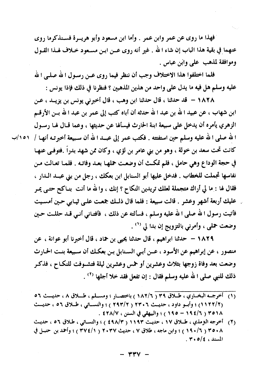 1828 - يُونُسُ قَدْ حَدَّثَنَا، قَالَ: حَدَّثَنَا ابْنُ وَهْبٍ، قَالَ: أَخْبَرَنِي يُونُسُ بْنُ يَزِيدَ، عَنِ ابْنِ شِهَابٍ، عَنْ عُبَيْدِ اللهِ بْنِ عَبْدِ اللهِ، حَدَّثَهُ، أَنَّ أَبَاهُ كَتَبَ إِلَى عُمَرَ بْنِ عَبْدِ اللهِ بْنِ الأَرْقَمِ الزُّهْرِيِّ يَأْمُرُهُ أَنْ يَدْخُلَ عَلَى سُبَيْعَةَ ابْنَةِ الْحَارِثِ، فَيَسْأَلُهَا عَنْ حَدِيثِهَا، وَعَمَّا قَالَ لَهَا رَسُولُ اللهِ صَلَّى اللَّهُ عَلَيْهِ وَسَلَّمَ حِينَ اسْتَفْتَتْهُ، فَكَتَبَ عُمَرُ إِلَى عَبْدِ اللهِ: " أَنْ سُبَيْعَةَ أَخْبَرَتْهُ أَنَّهَا كَانَتْ تَحْتَ سَعْدِ بْنِ خَوْلَةَ، وَهُوَ مِنْ بَنِي عَامِرِ بْنِ لُؤَيٍّ، وَكَانَ مِمَّنْ شَهِدَ بَدْرًا، فَتُوُفِّيَ عَنْهَا فِي حَجَّةِ الْوَدَاعِ وَهِيَ حَامِلٌ، فَلَمْ تَمْكُثْ أَنْ وَضَعَتْ حَمْلَهَا بَعْدَ وَفَاتِهِ، فَلَمَّا تَعَلَّتْ مِنْ نِفَاسِهَا تَجَمَّلَتْ لِلْخُطَّابِ، فَدَخَلَ عَلَيْهَا أَبُو السَّنَابِلِ بْنُ بَعْكَكٍ، رَجُلٌ مِنْ بَنِي عَبْدِ الدَّارِ، فَقَالَ لَهَا: مَالِي أَرَاكِ مُتَجَمِّلَةً، لَعَلَّكِ تُرِيدِينَ النِّكَاحَ؟ إِنَّكِ وَاللهِ مَا أَنْتِ بِنَاكِحٍ حَتَّى يَمُرَّ عَلَيْكِ أَرْبَعَةُ أَشْهُرٍ وَعَشْرٌ قَالَتْ سُبَيْعَةُ: فَلَمَّا قَالَ ذَلِكَ جَمَعْتُ عَلَيَّ ثِيَابِي حِينَ أَمْسَيْتُ، فَأَتَيْتُ رَسُولَ اللهِ صَلَّى اللَّهُ عَلَيْهِ وَسَلَّمَ، فَسَأَلْتُهُ عَنْ ذَلِكَ، فَأَفْتَانِي أَنِي قَدْ حَلَلْتُ حِينَ وَضَعْتُ حَمْلِي، وَأَمَرَنِي بِالتَّزْوِيجِ إِنْ بَدَا لِي "