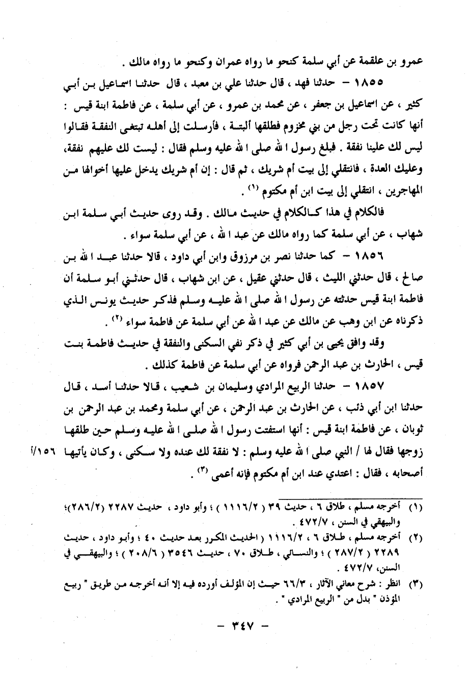 1855 - حَدَّثَنَا فَهْدٌ، قَالَ: حَدَّثَنَا عَلِيُّ بْنُ مَعْبَدٍ، قَالَ: حَدَّثَنَا إِسْمَاعِيلُ بْنُ أَبِي كَثِيرٍ، عَنْ إِسْمَاعِيلَ بْنِ جَعْفَرٍ، عَنْ مُحَمَّدِ بْنِ عَمْرٍو، عَنْ أَبِي سَلَمَةَ، عَنْ فَاطِمَةَ ابْنَةِ قَيْسٍ، أَنَّهَا كَانَتْ تَحْتَ رَجُلٍ مِنْ بَنِي مَخْزُومٍ، فَطَلَّقَهَا الْبَتَّةَ، فَأَرْسَلَتْ إِلَى أَهْلِهِ تَبْتَغِي النَّفَقَةَ، فَقَالُوا: لَيْسَ لَكِ عَلَيْنَا نَفَقَةٌ فَبَلَغَ رَسُولَ اللهِ صَلَّى اللَّهُ عَلَيْهِ وَسَلَّمَ، فَقَالَ: " لَيْسَتْ لَكِ عَلَيْهِمْ نَفَقَةٌ، وَعَلَيْكِ الْعِدَّةُ، فَانْتَقِلِي إِلَى بَيْتِ أُمِّ شَرِيكٍ "، ثُمَّ قَالَ: " إِنَّ أُمَّ شَرِيكٍ يَدْخُلُ عَلَيْهَا أَخْوَالُهَا مِنَ الْمُهَاجِرِينَ، انْتَقِلِي إِلَى بَيْتِ ابْنِ أُمِّ مَكْتُومٍ " فَالْكَلامُ فِي هَذَا كَالْكَلامِ فِي حَدِيثِ مَالِكٍ وَقَدْ رَوَى حَدِيثَ أَبِي سَلَمَةَ ابْنُ شِهَابٍ، عَنْ أَبِي سَلَمَةَ، كَمَا رَوَاهُ مَالِكٌ عَنْ عَبْدِ اللهِ، عَنْ أَبِي سَلَمَةَ، سَوَاءً