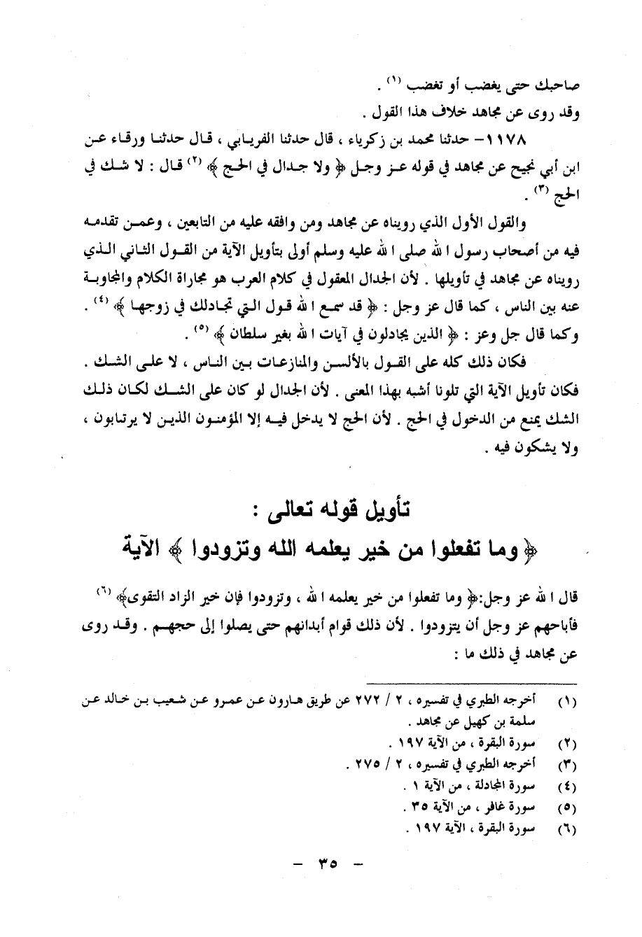 1178 - حَدَّثَنَا مُحَمَّدُ بْنُ زَكَرِيَّاءَ، قَالَ: حَدَّثَنَا الْفِرْيَابِيُّ، قَالَ: حَدَّثَنَا وَرْقَاءُ، عَنِ ابْنِ أَبِي نَجِيحٍ، عَنْ مُجَاهِدٍ، فِي قَوْلِهِ عَزَّ وَجَلَّ " {وَلا جِدَالَ فِي الْحَجِّ} ، قَالَ: لَا شَكَّ فِي الْحَجِّ " وَالْقَوْلُ الْأَوَّلُ الَّذِي رُوِّينَاهُ عَنْ مُجَاهِدٍ وَمَنْ وَافَقَهُ عَلَيْهِ مِنَ التَّابِعِينَ، وَعَمَّنْ تَقَدَّمَهُ فِيهِ مِنْ أَصْحَابِ رَسُولِ اللهِ صَلَّى اللَّهُ عَلَيْهِ وَسَلَّمَ أَوْلَى بِتَأْوِيلِ الْآيَةِ مِنَ الْقَوْلِ الثَّانِي الَّذِي رُوِّينَاهُ عَنْ مُجَاهِدٍ فِي تَأْوِيلِهَا، لِأَنَّ الْجِدَالَ الْمَعْقُولَ فِي كَلَامِ الْعَرَبِ هُوَ مُجَارَاةُ الْكَلَامِ وَالْمُجَاوَبَةُ عَنْهُ بَيْنَ النَّاسِ، كَمَا قَالَ عَزَّ وَجَلَّ: {قَدْ سَمِعَ اللهُ قَوْلَ الَّتِي تُجَادِلُكَ فِي زَوْجِهَا} ، وَكَمَا قَالَ اللهُ جلّ وَعز: {الَّذِينَ يُجَادِلُونَ فِي آيَاتِ اللهِ بِغَيْرِ سُلْطَانٍ أَتَاهُمْ} فَكَانَ ذَلِكَ كُلُّهُ عَلَى الْقَوْلِ بِالْأَلْسُنِ وَالْمُنَازَعَاتِ بَيْنَ النَّاسِ، لَا عَلَى الشَّكِّ، فَكَانَ تَأْوِيلُ الْآيَةِ الَّتِي تَلَوْنَا أَشْبَهَ بِهَذَا الْمَعْنَى، لِأَنَّ الْجِدَالَ لَوْ كَانَ عَلَى الشَّكِّ لَكَانَ ذَلِكَ الشَّكُّ يَمْنَعُ مِنَ الدُّخُولِ فِي الْحَجِّ، لِأَنَّ الْحَجَّ لَا يَدْخُلُ فِيهِ إِلَّا الْمُؤْمِنُونَ الَّذِينَ لَا يَرْتَابُونَ وَلَا يَشُكُّونَ فِيهِ