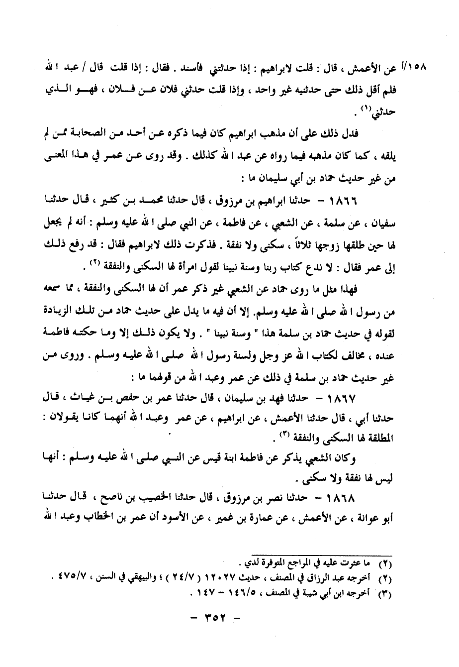 1866 - حَدَّثَنَا إِبْرَاهِيمُ بْنُ مَرْزُوقٍ، قَالَ: حَدَّثَنَا مُحَمَّدُ بْنُ كَثِيرٍ، قَالَ: حَدَّثَنَا سُفْيَانُ، عَنْ سَلَمَةَ، عَنِ الشَّعْبِيِّ، عَنْ فَاطِمَةَ، عَنِ النَّبِيِّ صَلَّى اللَّهُ عَلَيْهِ وَسَلَّمَ: " أَنَّهُ لَمْ يَجْعَلْ لَهَا حِينَ طَلَّقَهَا زَوْجُهَا ثَلاثًا، سُكْنَى وَلا نَفَقَةً " فَذَكَرْتُ ذَلِكَ لإِبْرَاهِيمَ، فَقَالَ: قَدْ رُفِعَ ذَلِكَ إِلَى عُمَرَ، فَقَالَ: لَا نَدَعُ كِتَابَ رَبِّنَا وَسُنَّةَ نَبِيِّنَا لِقَوْلِ امْرَأَةٍ لَهَا السُّكْنَى وَالنَّفَقَةُ فَهَذَا مِثْلُ مَا رَوَى حَمَّادٌ عَنِ الشَّعْبِيِّ غَيْرَ ذِكْرِ عُمَرَ أَنَّ لَهَا السُّكْنَى وَالنَّفَقَةَ، مِمَّا سَمِعَهُ مِنْ رَسُولِ اللهِ صَلَّى اللَّهُ عَلَيْهِ وَسَلَّمَ، إِلا أَنَّ فِيهِ مَا يَدُلُّ عَلَى حَدِيثِ حَمَّادٍ مِنْ تِلْكَ الزِّيَادَةِ لِقَوْلِهِ فِي حَدِيثِ حَمَّادِ بْنِ سَلَمَة هَذَا: " وَسُنَّةَ نَبِيِّنَا " وَلا يَكُونُ ذَلِكَ إِلا وَمَا حَكَتْهُ فَاطِمَةُ عِنْدَهُ مُخَالِفٌ لِكِتَابِ اللهِ عَزَّ وَجَلَّ وَلِسُنَّةِ رَسُولِ اللهِ صَلَّى اللَّهُ عَلَيْهِ وَسَلَّمَ وَرُوِيَ مِنْ غَيْرِ حَدِيثِ حَمَّادِ بْنِ سَلَمَةَ فِي ذَلِكَ عَنْ عُمَرَ وَعَبْدِ اللهِ مِنْ قَوْلِهِمَا مَا