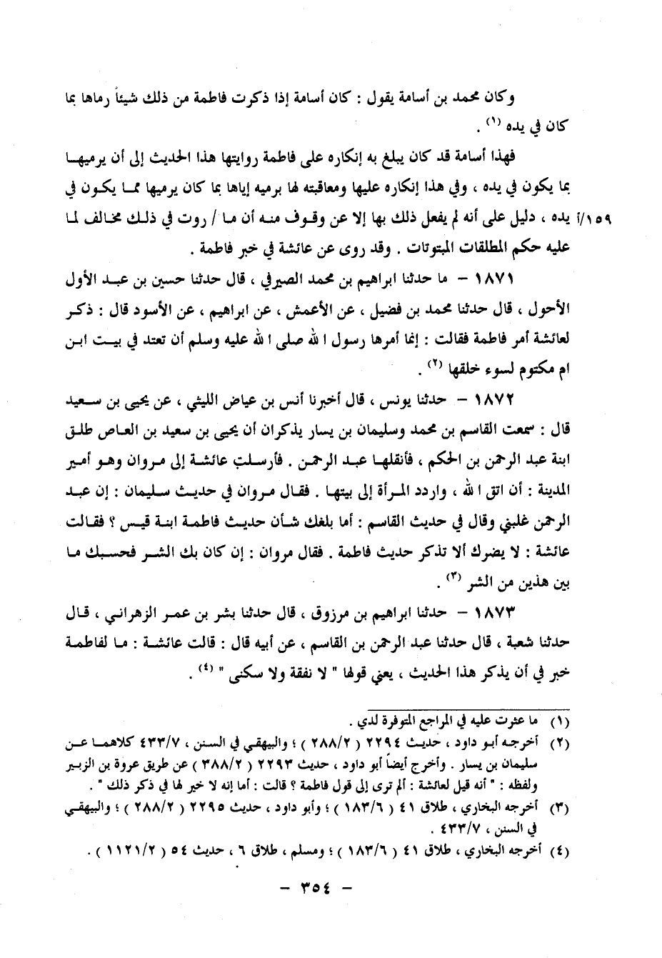 وَكَانَ مُحَمَّدُ بْنُ أُسَامَةَ يَقُولُ: كَانَ أُسَامَةُ إِذَا ذَكَرَتْ فَاطِمَةُ مِنْ ذَلِكَ شَيْئًا رَمَاهَا بِمَا كَانَ فِي يَدِهِ فَهَذَا أُسَامَةُ قَدْ كَانَ يَبْلُغُ بِهِ إِنْكَارُهُ عَلَى فَاطِمَةَ رِوَايَتَهَا هَذَا الْحَدِيثَ إِلَى أَنْ يَرْمِيَهَا بِمَا يَكُونُ فِي يَدِهِ، وَفِي هَذَا إِنْكَارُهُ عَلَيْهَا وَمُعَاقَبَتُهُ لَهَا بِرَمْيِهِ إِيَّاهَا بمَا كَانَ يَرْمِيهَا مِمَّا يَكُونُ فِي يَدِهِ، دَلِيلٌ عَلَى أَنَّهُ لَمْ يَفْعَلْ ذَلِكَ بِهَا إِلا عَنْ وُقُوفٍ مِنْهُ أَنَّ مَا رَوَتْ فِي ذَلِكَ مُخَالِفٌ لِمَا عَلَيْهِ حُكْمُ الْمُطَلَّقَاتِ الْمَبْتُوتَاتِ وَقَدْ رُوِيَ عَنْ عَائِشَةَ فِي خَبْرِ فَاطِمَةَ