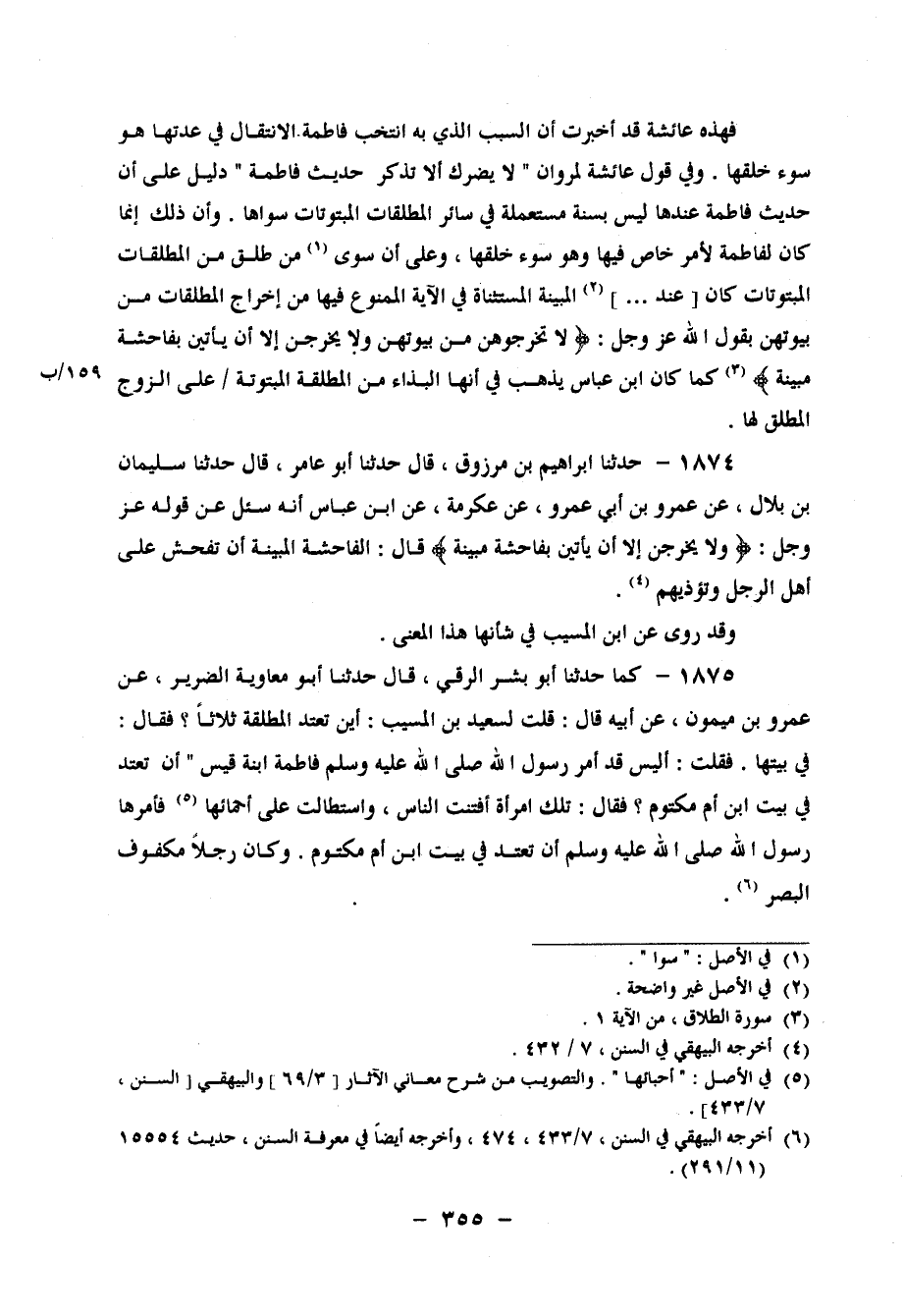 فَهَذِهِ عَائِشَةُ قَدْ أَخْبَرَتْ أَنَّ السَّبَبَ الَّذِي بِهِ انْتَخَبَ فَاطِمَةَ الانْتِقَالَ فِي عِدَّتِهَا هُوَ سُوءُ خُلُقِهَا، وَفِي قَوْلِ عَائِشَةَ لِمَرْوَانَ: " لَا يَضُرُّكَ أَلا تَذْكُرَ حَدِيثَ فَاطِمَةَ "، دَلِيلٌ عَلَى أَنَّ حَدِيثَ فَاطِمَةَ عِنْدَهَا لَيْسَ بِسُنَّةٍ مُسْتَعْمَلَةٍ فِي سَائِرِ الْمُطَلَّقَاتِ الْمَبْتُوتَاتِ سِوَاهَا، وَأَنَّ ذَلِكَ إِنَّمَا كَانَ لِفَاطِمَةَ لأَمْرٍ خَاصٍّ فِيهَا وَهُوَ سُوءُ خُلُقِهَا، وَعَلَى أَنَّ سِوَى مَنْ طُلِّقَ مِنَ الْمُطَلَّقَاتِ الْمَبْتُوتَاتِ كَانَ عِنْدَ الْمُبَيَّنَةِ الْمُسْتَثْنَاةِ فِي الآيَةِ الْمَمْنُوعِ فِيهَا مِنْ إِخْرَاجِ الْمُطَلَّقَاتِ مِنْ بُيُوتِهِنَّ بِقَوْلِ اللهِ عَزَّ وَجَلَّ: لَا تُخْرِجُوهُنَّ مِنْ