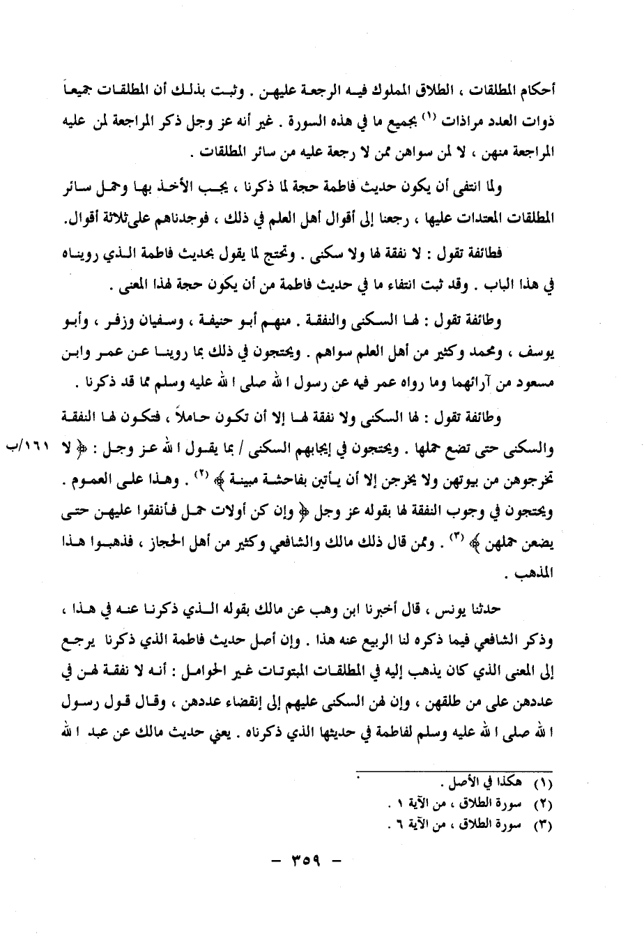التَّطْلِيقَتَيْنِ الأُولَيَيْنِ، فَإِذَا لَمْ تَخْرُجِ الطَّلْقَةُ الثَّالِثَةُ مِنْ أَنْ تُوقَعَ لِلْعِدَّةِ فِي طُهْرٍ لَا مَمَاسَّةَ فِيهِ، وَكَانَ عَلَيْهَا أَنْ تَعْتَدَّ لِلتَّطْلِيقَةِ الثَّالِثَةِ مِثْلَ مَا تَعْتَدُّ لِكُلِّ وَاحِدَةٍ مِنَ التَّطْلِيقَتَيْنِ الأُولَيَيْنِ مِنَ الشُّهُورِ أَوِ الْحَيْضِ عَلَى مَا بَيَّنَ اللهُ عَزَّ وَجَلَّ فِي ذَلِكَ فِي هَذِهِ السُّورَةِ، وَفِيمَا سِوَاهَا مِنَ الْقُرْآنِ، لَمْ تَخْرُجْ هَذِهِ التَّطْلِيقَةُ أَيْضًا مِمَّا كَانَ لَهَا مِنَ السُّكْنَى وَالنَّفَقَةِ كَمَا لَمْ تَخْرُجْ مِمَّا كَانَ عَلَيْهَا، وَلَهَا سَائِرُ